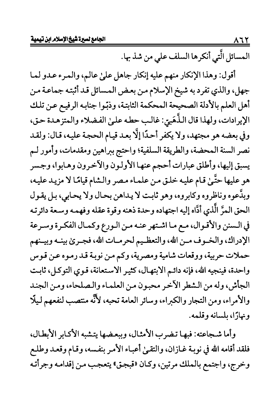 أقول: وهذا الإنكار منهم عليه إنكار جاهل على عالم، والمرء عدو لما جهل، والذي تفرد به شيخ الإسلام من بعض المسائل قد أثبته جماعة من أهل العلم بالأدلة الصحيحة المحكمة الثابتة، وذبّوا جنابه الرفيع عن تلك الإيرادات، ولهذا قال الذَّهَبيّ: غالب حطه على الفضلاء والمتزهدة حق، وفي بعضه هو مجتهد، ولا يكفر أحدًا إلَّا بعد قيام الحجة عليه، قال: ولقد نصر السنة المحضة، والطريقة السلفية؛ واحتج ببراهين ومقدمات، وأمور لم يسبق إليها، وأطلق عبارات أحجم عنها الأولون والآخرون وهابوا، وجسر هو عليها حتَّى قام عليه خلق من علماء مصر والشام قيامًا لا مزيد عليه، وبدَّعوه وناظروه وكابروه، وهو ثابت لا يداهن بحال ولا يحابي، بل يقول الحق المرَّ الَّذي أدَّاه إليه اجتهاده وحدة ذهنه وقوة عقله وفهمه وسعة دائرته في السنن والأقوال، مع ما اشتهر عنه من الورع وكمال الفكرة وسرعة الإدراك، والخوف من الله، والتعظيم لحرمات الله، فجرى بينه وبينهم حملات حربية، ووقعات شامية ومصرية، وكم من نوبة قد رموه عن قوس واحدة، فينجيه الله، فإنه دائم الابتهال، كثير الاستعانة، قوي التوكل، ثابت الجأش، وله من الشطر الآخر محبون من العلماء والصلحاء، ومن الجند والأمراء، ومن التجار والكبراء، وسائر العامة تحبه، لأَنَّه منتصب لنفعهم ليلًا ونهارًا، بلسانه وقلمه.
