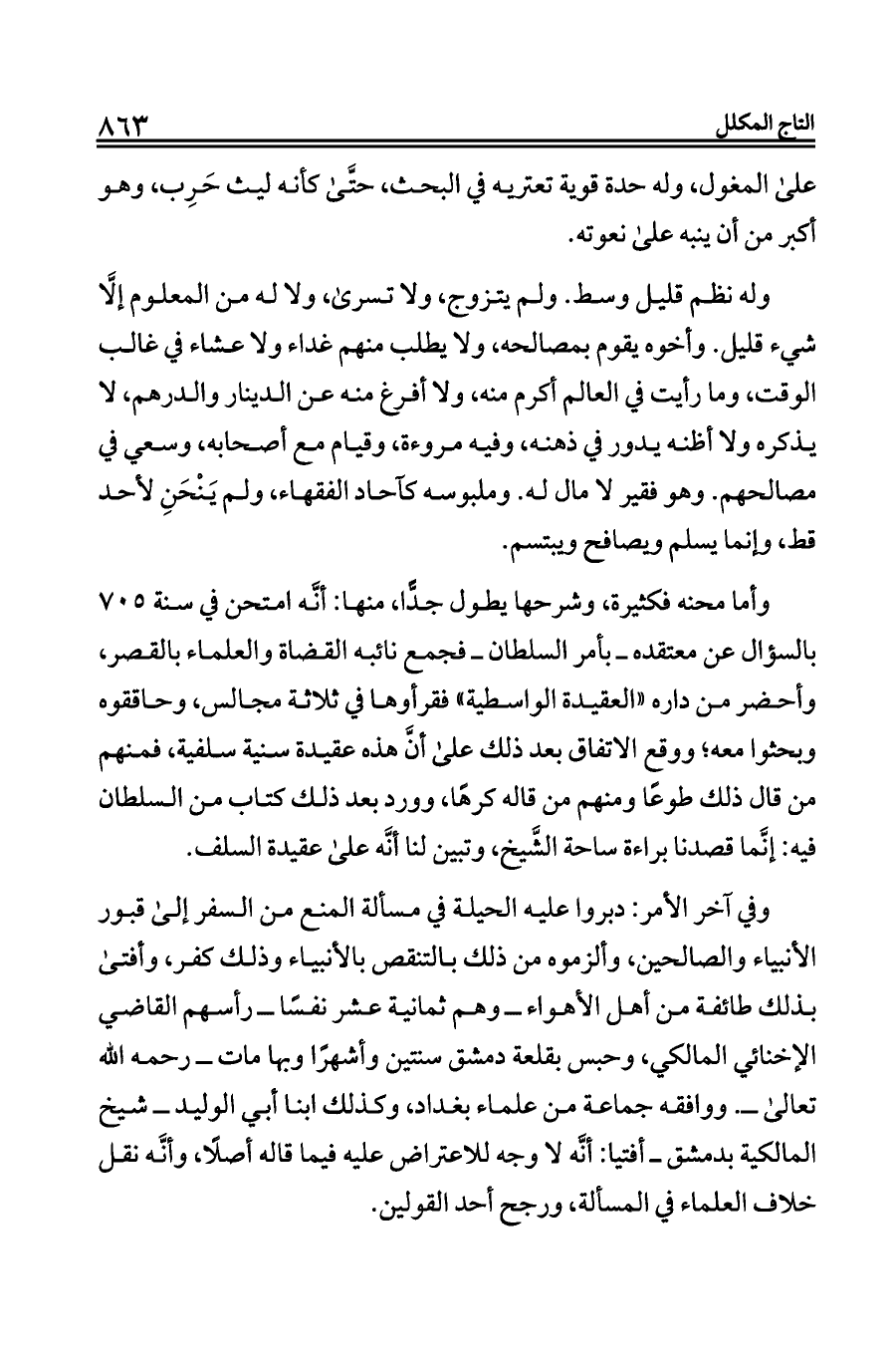 على المغول، وله حدة قوية تعتريه في البحث، حتَّى كأنه ليث حَرِب، وهو أكبر من أن ينبه على نعوته.