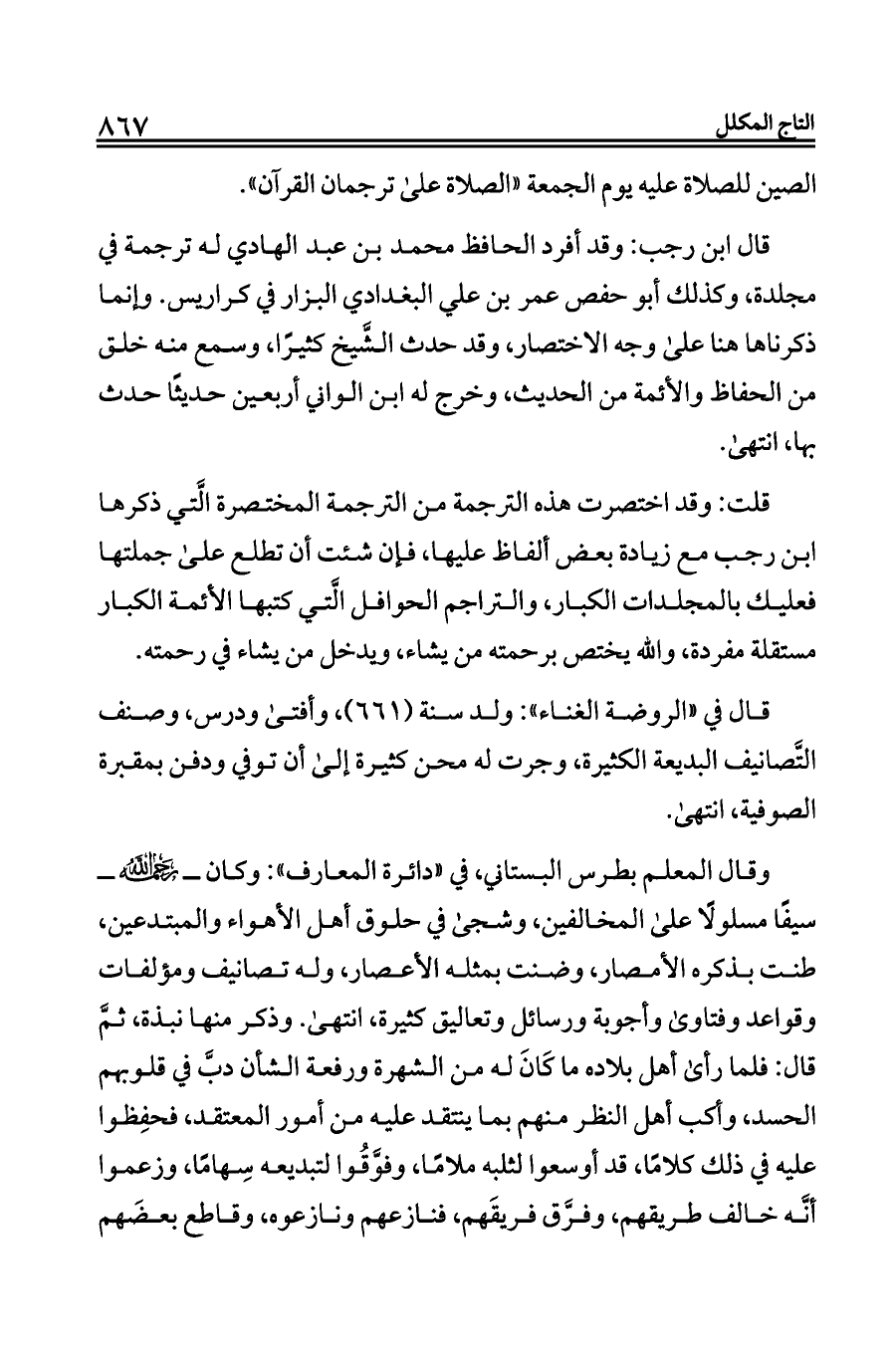 قلت: وقد اختصرت هذه الترجمة من الترجمة المختصرة الَّتي ذكرها ابن رجب مع زيادة بعض ألفاظ عليها، فإن شئت أن تطلع على جملتها فعليك بالمجلدات الكبار، والتراجم الحوافل الَّتي كتبها الأئمة الكبار مستقلة مفردة، والله يختص برحمته من يشاء، ويدخل من يشاء في رحمته.