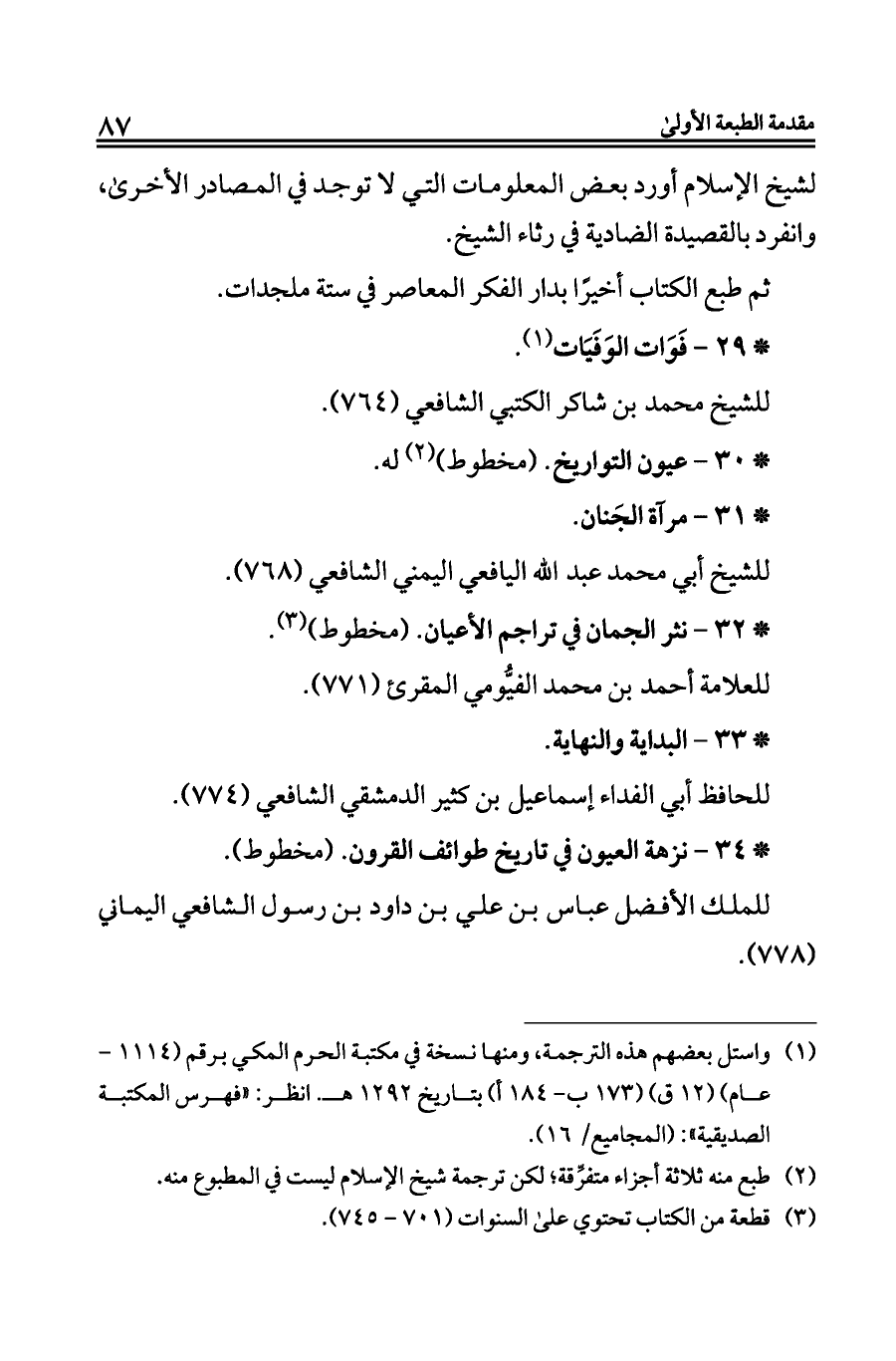 (¬٢). طبع منه ثلاثة أجزاء متفرِّقة؛ لكن ترجمة شيخ الإسلام ليست في المطبوع منه.