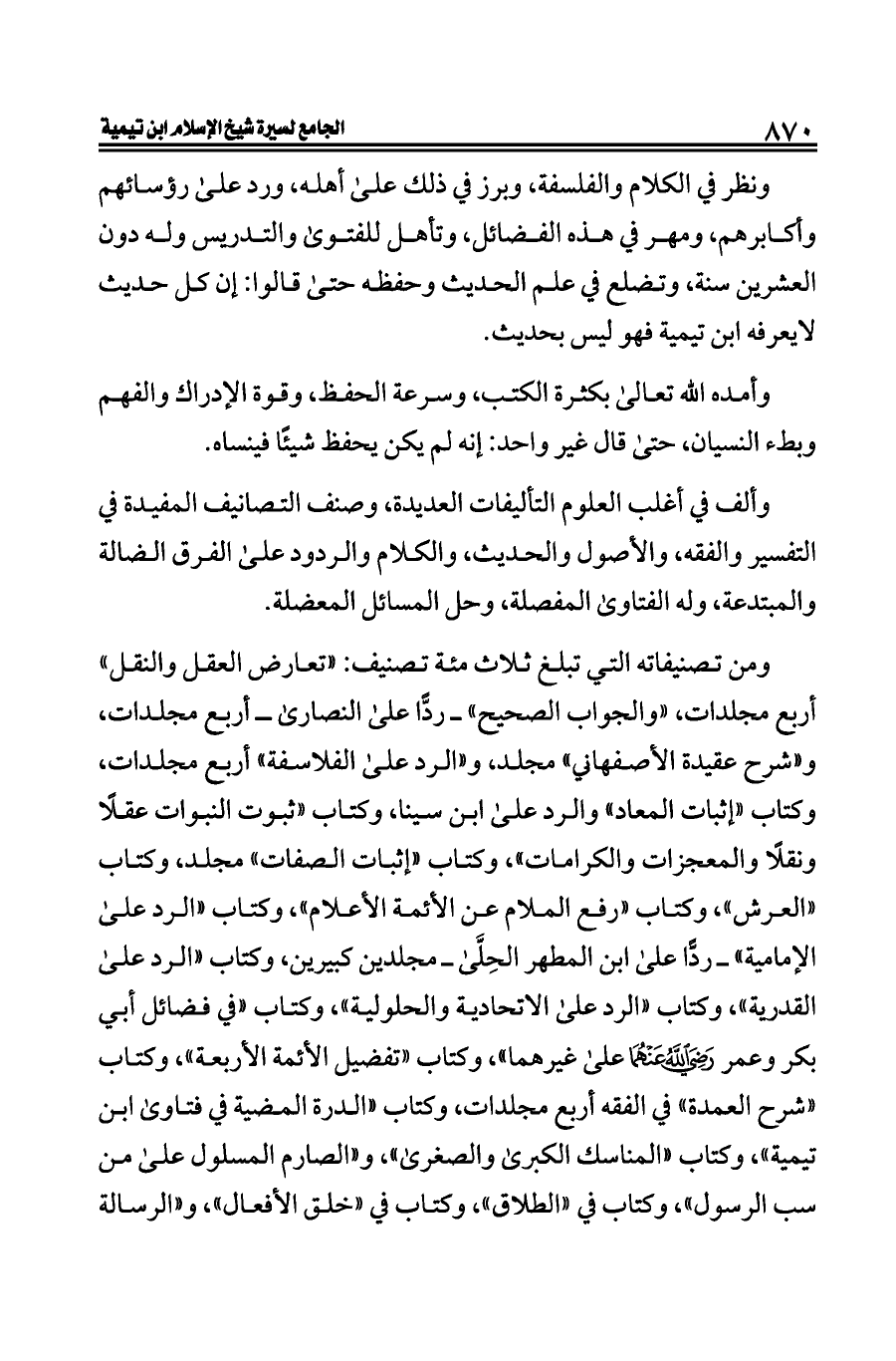 ومن تصنيفاته التي تبلغ ثلاث مئة تصنيف: «تعارض العقل والنقل» أربع مجلدات، «والجواب الصحيح» ــ ردًّا على النصارى ــ أربع مجلدات، و «شرح عقيدة الأصفهاني» مجلد، و «الرد على الفلاسفة» أربع مجلدات، وكتاب «إثبات المعاد» والرد على ابن سينا، وكتاب «ثبوت النبوات عقلًا ونقلًا والمعجزات والكرامات»، وكتاب «إثبات الصفات» مجلد، وكتاب «العرش»، وكتاب «رفع الملام عن الأئمة الأعلام»، وكتاب «الرد على الإمامية» ــ ردًّا على ابن المطهر الحِلَّى ــ مجلدين كبيرين، وكتاب «الرد على القدرية»، وكتاب «الرد على الاتحادية والحلولية»، وكتاب «في فضائل أبي بكر وعمر - رضي الله عنهما - على غيرهما»، وكتاب «تفضيل الأئمة الأربعة»، وكتاب «شرح العمدة» في الفقه أربع مجلدات، وكتاب «الدرة المضية في فتاوى ابن تيمية»، وكتاب «المناسك الكبرى والصغرى»، و «الصارم المسلول على من سب الرسول»، وكتاب في «الطلاق»، وكتاب في «خلق الأفعال»، و «الرسالة