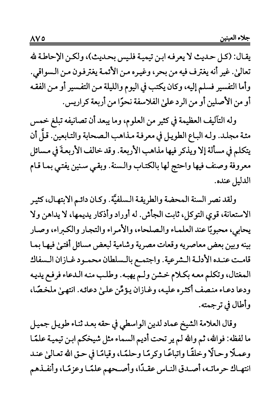 ولقد نصر السنة المحضة والطريقة السلفيَّة. وكان دائم الابتهال، كثير الاستعانة، قوي التوكل، ثابت الجأش. له أوراد وأذكار يديمها، لا يداهن ولا يحابي، محبوبًا عند العلماء والصلحاء، والأمراء والتجار والكبراء، وصار بينه وبين بعض معاصريه وقعات مصرية وشامية لبعض مسائل أفتى فيها بما قامت عنده الأدلة الشرعية. واجتمع بالسلطان محمود غازان السفاك المغتال، وتكلم معه بكلام خشن ولم يهبه. وطلب منه الدعاء فرفع يديه ودعا دعاء منصف أكثره عليه، وغازان يؤمِّن على دعائه. انتهى ملخصًا، وأطال في ترجمته.
