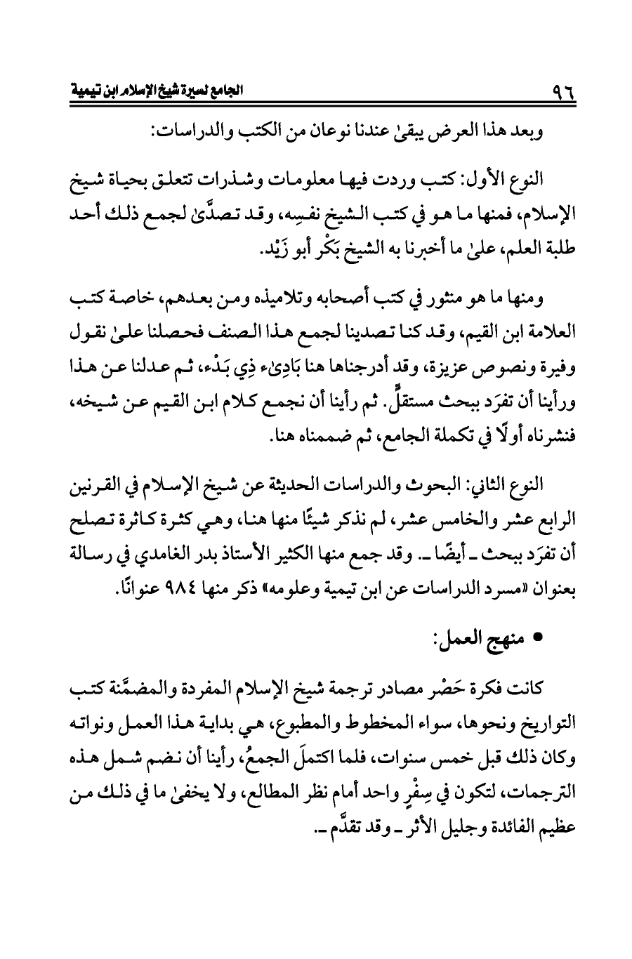 كانت فكرة حَصْر مصادر ترجمة شيخ الإسلام المفردة والمضمَّنة كتب التواريخ ونحوها، سواء المخطوط والمطبوع، هي بداية هذا العمل ونواته وكان ذلك قبل خمس سنوات، فلما اكتملَ الجمعُ، رأينا أن نضم شمل هذه الترجمات، لتكون في سِفْرٍ واحد أمام نظر المطالع، ولا يخفى ما في ذلك من عظيم الفائدة وجليل الأثر ــ وقد تقدَّم ــ.