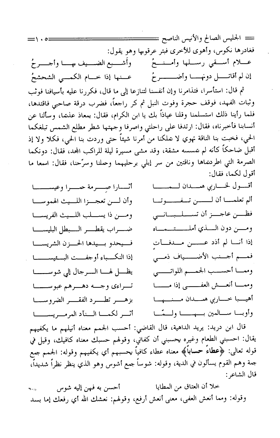 قَالَ ابْن دُرَيْد: يُرِيد الداهية، قَالَ القَاضِي: أَحسب الجمم مَعْنَاهُ أنيلهم مَا يَكفهمْ يُقَالُ: أحسبني الطَّعَام وَغَيره يحسبني أَن كفاني، وَقَوْلهمْ حَسبك مَعْنَاهُ كافيك، وَقيل فِي قَوْله تَعَالَى: " عَطَاءً حسابا " مَعْنَاهُ عَطاء كَافِيا يَحْسبهُم أَي يكفيهم وَقَوله: الْجُمم جمعُ جُمة وهم الْقَوْم يسْأَلُون فِي الدِّيَة، وَقَوله: شوسًا جمع أشوس وَهُوَ الَّذِي ينظر نظرا شَدِيدا، قَالَ الشَّاعِر: