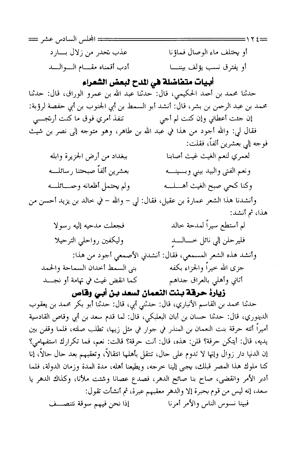 حَدَّثَنَا مُحَمَّد بْن القَاسِم الأنبَاريّ، قَالَ: حَدَّثَنِي أَبِي، قَالَ: حَدَّثَنَا أَبُو بَكْر مُحَمَّد بْن يَعْقُوب الدينَوَرِي، قَالَ: حَدَّثَنَا حَسّان بْن أبان البَعْلَبَكيّ، قَالَ: لمّا قَدِمَ سَعْد بْن أبي وَقاص الْقَادِسِيَّة أَمِيرا أتتْه حرقة بِنْت النُّعْمَان بْن الْمُنْذر فِي جَوَارٍ فِي مثل زِيَّها، تطلب صِلَته، فَلَمّا وقفن بَيْنَ يَدَيْهِ، قَالَ: أيتكن حرقة؟ قُلْنَ: هَذِهِ، قَالَ: أَنْت حرقة؟ قَالَتْ: نَعَمْ، فَمَا تكرارك استفهامي؟ إِن الدُّنْيَا دَار زَوَال وَإِنَّهَا لَا تدوم على حَال، تنْتَقل بِأَهْلِهَا انتقالا، وتُعقبهم بَعْدَ حَال حَالا، إِنَّا كنتا ملوكَ هَذَا الْمِصْرِ قبلك، يُجْبى إِلَيْنَا خَرْجه، ويُطيعنا أَهله، مدَّة الْمدَّة وزمان الدّولة، فَلَمّا أدبر الْأَمر وانقضى، صَاح بِنَا صائحُ الدَّهْر، فصدع عصانا وشتّتَ ملأنا، وكذاك الدَّهْر يَا سَعْد، إِنَّهُ لَيْسَ من قَوْمٍ بحبرة إِلَّا والدهر مُعقبهم عَبْرة، ثُمَّ أنشأت تَقول: