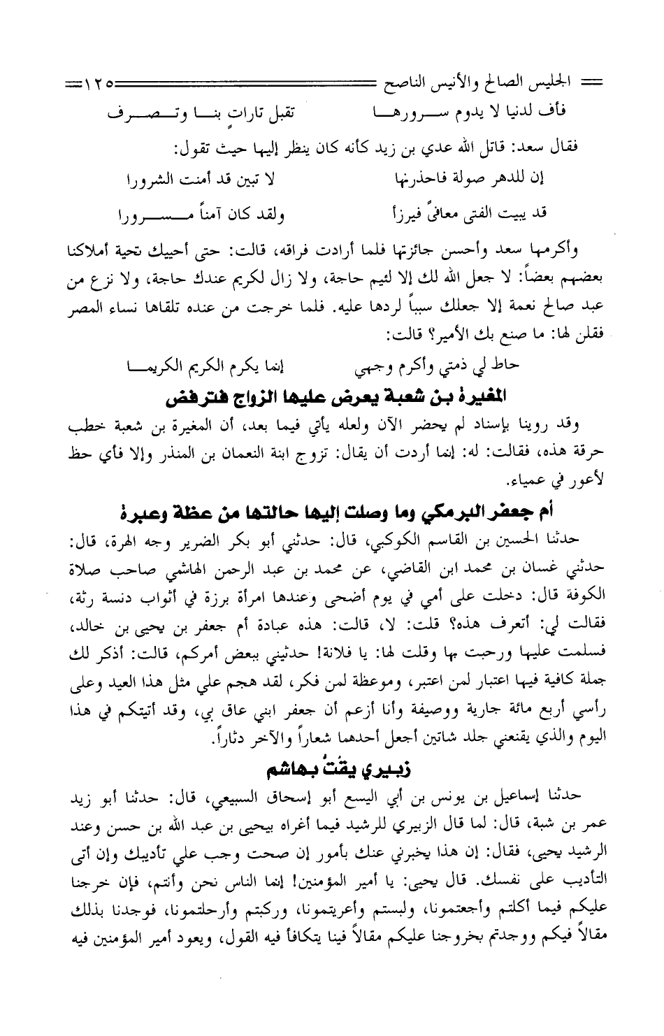 حَدَّثَنَا الْحُسَيْن بْن القَاسِم الكوكبي، قَالَ: حَدَّثَنِي أَبُو بَكْر الضَّرِير وَجه الْهِرَّة، قَالَ: حَدَّثَنِي غَسَّان بْن مُحَمَّد بْن القَاضِي، عَنْ مُحَمَّد بْن عَبْد الرَّحْمَن الهاشميّ صَاحب صَلاة الْكُوفَة قَالَ: دخلتُ عَلَى أمِّي فِي يَوْمَ أضحى وَعِنْدهَا امْرَأَة بَرزَة فِي أَثوَاب دنسة رثَّة، فَقَالَت لي: أتعرفُ هَذِهِ؟ قلت: لَا، قَالَتْ: هَذِهِ عبَادَة أم جَعْفَر بْن يحيى بْن خَالِد، فسلّمت عَلَيْهَا ورحبت بهَا وَقتل لَهَا: يَا فُلَانَة! حدثيني بِبَعْض أَمركُم، قَالَتْ: أذكُر لَك جملَة كَافِيَة فِيهَا اعْتِبَار لمن اعْتبر، وموعظة لمن فكر، لَقَدْ هجم عليّ مثل هَذَا الْعِيد وعَلى رَأْسِي أَربع مائَة جَارِيَة ووصيفة وَأَنا أزعم أنَّ جَعْفَر ابْني عاقٌّ بِي، وَقد أتيتكم فِي هَذَا الْيَوْم وَالَّذِي يُقْنعني جلدُ شَاتين أجعَل أَحدهمَا شعاراً وَالْآخر دثارًا.