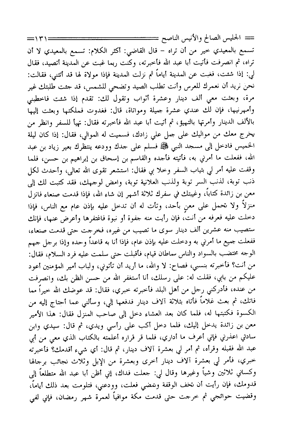 تسمع بالْمُعَيْديّ خيرٌ من أَن ترَاهُ - قَالَ القَاضِي: أَكثر الْكَلَام: تسمع بالمعيديِّ لَا أَن ترَاهُ، ثُمَّ انصرفتُ فَأتيت أَبَا عَبْد اللَّه فَأَخْبَرته، وَكنت رُبمَا غِبْتُ عَنِ المَدِينَةِ أتصيّد، فَقَالَ لي: إِذَا شِئْت، فغبت عَنِ المَدِينَةِ أَيَّامًا ثُمَّ نزلت المَدِينَةِ فَإِذا مولاةٌ لَهَا قَدْ أَتَتْنِي، فَقَالَت: نَحْنُ نُرِيد أَن نُعَمِّرَك للعُرْس وَأَنت تطلب الصَّيْد وتضحى للشمس، قَدْ جئتُ طلبتُك غَيْر مرّة، وبعثتْ معي ألفَ دِينَار وَعشرَة أَثوَاب وَتقول لَك: تقدمْ إِذَا شِئْت فاخطبني وأمهرنيها، فَإِن لَك عِنْدي عشرَة جميلَة ومواتاة، قَالَ: فغدوتُ فملكتها وَبعثت إِلَيْهَا بِالْألف الدِّينَار وأمرتها بالتهيؤ، ثُمَّ أتيتُ أَبَا عَبْد اللَّه فَأَخْبَرته فَقَالَ: تهيّأ للسَّفر وَانْظُر من يَخْرُج مَعَك من مواليك عَلَى جَمَلٍ عَليّ زَادُك، فسميتُ لَهُ الموَالِي، فَقَالَ: إِذَا كَانَ لَيْلَة الْخَمِيس فادخُل إِلَى مَسْجِد النَّبيّ صَلَّى اللهُ عَلَيْهِ وَسَلَّمَ فسلِّم عَلَى جَدِّك وودِّعْه ينتظرك بعيرُ زِيَاد بْن عَبْد اللَّه، فَفعلت مَا أَمرنِي بِهِ، فأتيتُه فأجده وَالقَاسِم بْن إِسْحَاق بْن إِبْرَاهِيم بْن حَسَن، فَلَمّا وقفتُ عَلَيْهِ أَمر لي بِثِيَاب السَّفَر وخلا بِي فَقَالَ: استشْعر تقوى اللَّه تَعَالَى، وأحْدِث لكلِّ ذَنْب تَوْبَة، لذنب السِّرِّ تَوْبَة ولذنب الْعَلَانِيَة تَوْبَة، وامض لوجهك، فقد كتبت لَك إِلَى معن بْن زَائِدَة كتابا، وغَيْبَتُك فِي سفرك ثَلَاثَة أشهر إنْشَاء اللَّه، فَإِذا قدمت صنعاء فَانْزِل منزلا وَلَا تحمل عَلَى معنٍ بِأحد، وتأتَّ لَهُ أَن تَدْخُل عَلَيْهِ بِإِذن عَامَ مَعَ النّاس، فَإِذا دخلتَ عَلَيْهِ فعرَّفْه من أَنْت، فَإِن رَأَيْت مِنْهُ جَفْوةً أَوْ نبوة فاغتفرْها وَأعْرض عَنْهَا، فَإنَّك ستصيبُ مِنْهُ عشْرين ألف دِينَار سوى مَا تصيب من غَيره، فخرجتُ حَتَّى قدمت صنعاء، فَفعلت جَمِيع مَا أَمرنِي بِهِ ودخلتُ عَلَيْهِ بِإِذن عَامَ، فَإِذا أَنَا بِهِ قَاعِدا وَحده وَإِذا بِرَجُل جهم الْوَجْه مختضب بِالسَّوَادِ وَالنَّاس سِماطان قيام، فَأَقْبَلت حَتَّى سلّمت عَلَيْهِ فردّ السّلام، فَقَالَ: من أَنْت؟ فَأَخْبَرته بنسبي، فصاح: لَا وَالله، مَا أُرِيد أَن تَأْتُونِي، ولَبَابُ أميرِ الْمُؤمنِينَ أَعُود عَلَيْكُمْ من بَابي، فَقلت لَهُ: عَلَى رسلك، أَنَا أسْتَغْفر اللَّه من حَسَن الظَّن بك، وانصرفت من عِنْدَهُ، فأدركني رَجُل من أَهْلَ الْبَلَد فأخبرتُه خبري، فَقَالَ: قَدْ عَوَّضَك اللَّه خَيْرًا ممّا فاتك، ثُمَّ بعث غُلَاما فَأَتَاهُ بِثَلَاثَة آلَاف دِينَار فَدَفعهَا إِلَيّ، وسألني عَمَّا أحتاج إِلَيْهِ من الْكسْوَة فكتبتها لَهُ، فَلَمّا كَانَ بَعْدَ الْعشَاء دَخَلَ إِلَى صَاحب الْمنزل فَقَالَ: هَذَا الْأَمِير معن بْن زَائِدَة يدْخل إِلَيْكَ، فَلَمّا دَخَلَ أكبِّ عَلَى رَأْسِي ويدي، ثمَّ قَالَ: سَيِّدي وَابْن سادتي اعذرني فَإِنِّي أعرف مَا أداري، فَلَمَّا قر قراره أعلمتُه بِالْكتاب الَّذِي معي من أبي عَبْد اللَّه فَقبله وقرأه، ثُمَّ أَمر لي بِعشْرَة آلَاف دِينَار، ثمَّ قَالَ: أَي شَيْء أقدمك؟ فَأَخْبَرته خبري، فَأمر لي بِعشْرَة آلَاف دِينَار أُخْرَى وبعشرة من الْإِبِل وَثَلَاث نَجَائِب برجالها وكساني ثَلَاثِينَ وَشْيًا وَغَيرهَا وَقَالَ لي: جُعلت فدَاك، إِنِّي أَظن أَبَا عَبْد اللَّه متطلِّعًا إِلَى قُدومك، فَإِن رَأَيْت أَن تُخِفَّ الوقْفة وتمضي فعلتَ، وودَّعَني، فتلومت بَعْدَ ذَلِكَ أَيَّامًا، وقضيتُ حوائجي ثُمَّ خرجت حَتَّى قدمت مكَّة موافيًا لعُمْرة شهر رَمَضَان، فَإِنِّي لفي