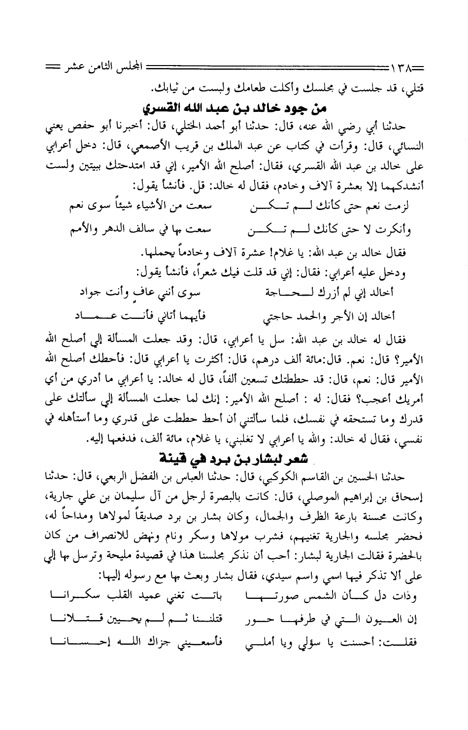 حَدَّثَنَا أبي رَضِيَ اللَّه عَنْهُ، قَالَ: حَدَّثَنَا أَبُو أَحْمَد الْخُتلِي، قَالَ: أَخْبَرَنَا أَبُو حَفْص يَعْنِي النَّسَائيّ، قَالَ: وقرأت فِي كتاب عَنْ عَبْد الْملك بن قريب الْأَصْمَعِي، قَالَ: دَخَلَ أَعْرَابِي عَلَى خَالِد بْن عَبْد اللَّه الْقَسرِي، فَقَالَ: أصلح اللَّه الْأَمِير، إِنِّي قَد امتدحتك ببيتين وَلست أنشدكهما إِلَّا بِعشْرَة آلَاف وخادم، فَقَالَ لَهُ خَالِد: قل. فَأَنْشَأَ يَقُولُ: