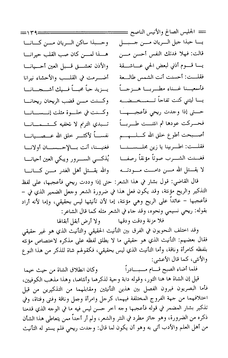 قَالَ القَاضِي: قَول بشار فِي هَذَا الشّعْر: حَتَّى إِذا وددت ريحي فأعجبها، عَلَى لفظ التَّذْكِير وَالرِّيح مُؤَنّثَة، وَقد يكن فعل هَذَا فِي ضَرُورَة الشّعْر وَجعل الضَّمِير الَّذِي فِي - فأعجبها - عَائِدًا عَلَى الرّيح وَهِي مُؤَنّثَة، إِمَّا لِأَن تأنيثها لَيْسَ بحقيقي، وَإِمَّا لأنَّه أَرَادَ بقوله: ريحي نسيمي وَنَحْوه، وَقد جَاءَ فِي الشّعْر مثله كَمَا قَالَ الشَّاعِر: