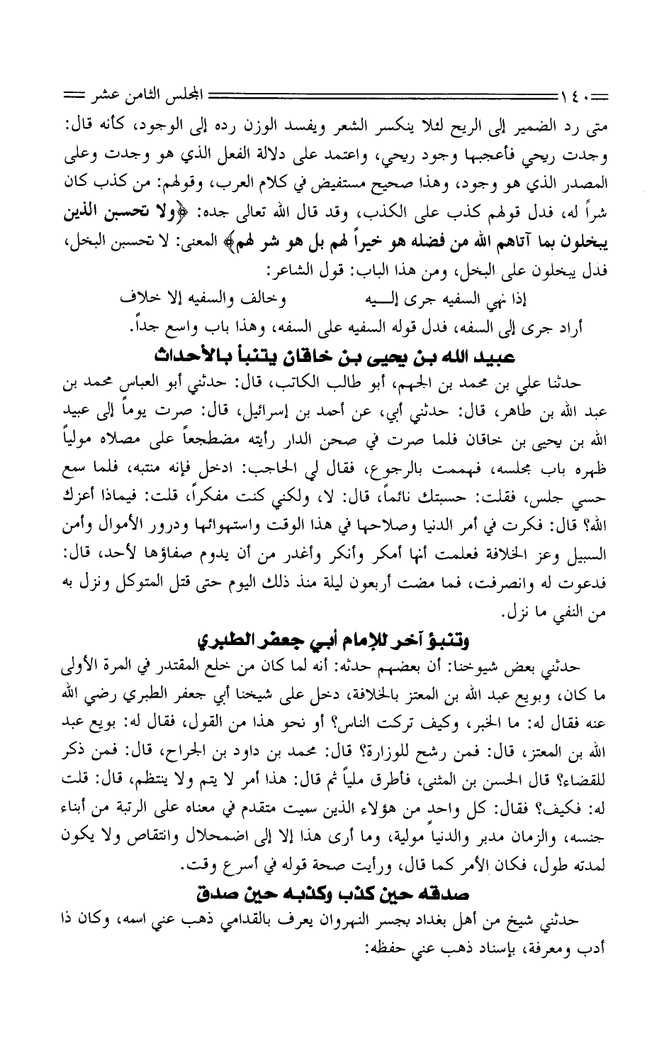 حَدثنِي بعض شُيُوخنَا: أنَّ بعضَهم حَدثهُ: أَنَّهُ لمّا كَانَ من خلع الْمُقْتَدِر فِي الْمرة الأولى مَا كَانَ، وبُويع عَبْد اللَّه بْن الْمُعتزِّ بالخلافة، دَخَلَ عَلَى شَيخنَا أبي جَعْفَر الطَّبَريّ رَضِيَ اللَّه عَنْهُ فَقَالَ لَهُ: مَا الخَبر، وَكَيف تركتَ النّاس؟ أَوْ نَحْو هَذَا من القَوْل، فَقَالَ لَهُ: بُويع عَبْد اللَّه بْن المعتز، قَالَ: فَمَنْ رُشِّح للوزارة؟ قَالَ: مُحَمَّد بْن دَاوُد بْن الجَرَّاح، قَالَ: فَمن ذُكِر للْقَضَاء؟ قَالَ الْحَسَن بْن الْمُثَنى، فَأَطْرَقَ ملِيًّا ثُمَّ قَالَ: هَذَا أمرُ لَا يتمُّ وَلَا يَنْتَظِم، قَالَ: قلت لَهُ: فَكيف؟ فَقَالَ: كلّ واحدٍ من هَؤُلَاءِ الَّذين سَمّيت مُتَقَدِّمٌ فِي مَعْنَاهُ عَلَى الرّتْبة من أَبنَاء جنسه، وَالزَّمَان مُدبر والدُّنْيا مُوَليَّة، وَمَا أرى هَذَا إِلَّا إِلَى اضمحلال وانتقاص وَلَا يكون لمدته طول، فَكَانَ الْأَمر كَمَا قَالَ، وَرَأَيْت صِحَة قَوْله فِي أسْرع وَقت.