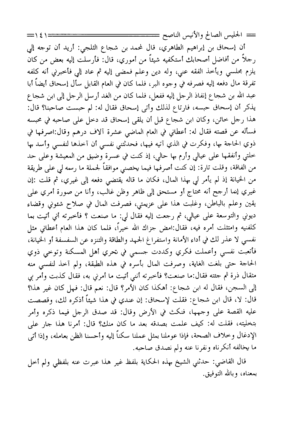 أنَّ إِسْحَاق بْن إِبْرَاهِيم الطاهري، قَالَ لمُحَمد بْن شُجَاع الثّلجي: أُرِيد أَن تُوَجِّه إليَّ رَجُلا من أفاضل أَصْحَابك أستكفيه شَيئًا من أموري، قَالَ: فأرسلتُ إِلَيْهِ بعضَ من كَانَ يَلزم مجلسي وَيَأْخُذ الْفِقْه عني، وَله دينٌ وعِلمٌ فَمضى إِلَيْهِ ثُمَّ عَاد إليَّ فَأَخْبرنِي أَنَّهُ كَلّفه تَفْرِقَة مَال دَفعه إِلَيْهِ فَصَرفهُ فِي وُجُوه الْبر، فَلَمّا كَانَ فِي الْعَام الْقَابِل سَأَلَ إِسْحَاق أَيْضا أَبَا عَبْد اللَّه بْن شُجَاع إِنْفَاذ الرَّجُل إِلَيْهِ فَفعل، فَلَمّا كَانَ من الْغَد أرسل الرَّجُل إِلَى ابْن شُجَاع يذكر أنَّ إِسْحَاق حَبسه، فارتاع لذَلِك وأتى إِسْحَاق فَقَالَ لَهُ: لَمْ حبست صاحبنا؟ قَالَ: هَذَا رجلٌ خائن، وَكَانَ ابْن شُجَاع قَبْلَ أَن يَلْقى إِسْحَاق قَدْ دَخَلَ عَلَى صَاحبه فِي محبسه فَسَأَلَهُ عَنْ قصَّته فَقَالَ لَهُ: أَعْطَانِي فِي الْعَام الْمَاضِي عشرَة آلَاف دِرْهَم وَقَالَ: اصرفها فِي ذَوي الْحَاجة بهَا، وفكّرتُ فِي الَّذِي آتيه فِيهَا، فحدَّثَتْني نَفسِي أَن آخذها لنَفْسي وَأسد بهَا خلتي وأنفقها على عيالي وأَرُمُّ بهَا حَالي، إِذْ كنتُ فِي عُسرة وضيق من الْمَعيشَة وعَلى حدٍّ من الْفَاقَة، وَقلت تَارَة: إِن كنت أصرفها فِيمَا يخصني موافقاَ لجملة مَا رسمه لي عَلَى طَريقَة من الْخِيَانَة إِذْ لَمْ يَأْمر لي بِهَذَا المَال، فَكَانَ مَا قَالَه يَقْتَضِي دَفعه إِلَى غَيْرِي، ثُمَّ قلت: إِن غَيْرِي إِنَّمَا أُرَجِّحُ أَنَّهُ مُحْتَاج أَوْ مُسْتَحقّ إِلَى ظَاهر وظَنِّ غَالب، وَأَنا من صُورَة أَمْرِي عَلَى يَقِين وَعلم بالباطن، وغَلّبت هَذَا عَلَى عزيمتي، فصرفتُ المَال فِي صَلَاح شئوني وَقَضَاء ديوني والتوسعة عَلَى عيالي، ثُمَّ رجعتُ إِلَيْهِ فَقَالَ لي: مَا صنعت؟ فَأَخْبَرته أَنِّي أتيت بِمَا كلفنيه وامتثلت أمره فِيهِ، فَقَالَ: امْضِ جَزَاك اللَّه خيرا، فَلَمّا كَانَ هَذَا الْعَام أَعْطَانِي مثل نَفسِي لَا عذر لَك فِي أَدَاء الْأَمَانَة واستفراغ الْجهد والطاقة والتنزه عَنِ السفسفة أَو الْخِيَانَة، فأتعبت نَفسِي وأعملت فكري وكددت جسمي فِي تحري أَهْلَ المسكنة وتوخي ذَوي الْحَاجة حَتَّى بلغت الْغَايَة، وصرفت المَال بأسره فِي هَذِهِ الطَّبَقَة، وَلم آخذ لنَفْسي مِنْهُ مِثْقَال ذرة ثُمَّ جِئْته فَقَالَ: مَا صنعت؟ فَأَخْبَرته أنني أتيتُ مَا أَمرنِي بِهِ، فَقَالَ كذبت وَأمر بِي إِلَى السجْن، فَقَالَ لَهُ ابْن شُجَاع: أهكذا كَانَ الْأَمر؟ قَالَ: نَعَمْ قَالَ: فَهَل كَانَ غَيْر هَذَا؟ قَالَ: لَا، قَالَ ابْن شُجَاع: فَقلت لإسحاق: إِن عِنْدِي فِي هَذَا شَيئًا أذكرهُ لَك، وفصصت عَلَيْهِ الْقِصَّة عَلَى وَجههَا، فنكث فِي الأَرْض وَقَالَ: قَدْ صدق الرجل فِيمَا ذكره وَأمر بِتَخْلِيَتِهِ، فَقلت لَهُ: كَيْفَ علمت بصدقه بَعْدَ مَا كَانَ مِنْك؟ قَالَ: أمْرُنَا هَذَا جَار عَلَى الإدغال وَخلاف الصِّحَّة، فَإِذا عوملنا بِمثل عَملنَا سَكَنا إِلَيْهِ وأحسنّا الظّن بعامله، وَإِذا أَتَى مَا يُخَالِفهُ أنكرناه ونفرنا عَنْهُ وَلم نصدق صَاحبه.