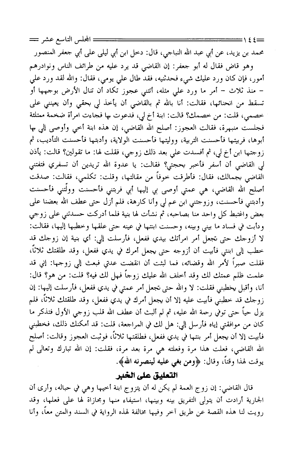 وَهُوَ قاضٍ فَقَالَ لَهُ أَبُو جَعْفَر: إِن القَاضِي قَدْ يرد عَلَيْهِ من طرائف النّاس ونوادرهم أُمُور، فَإِن كَانَ ورد عَلَيْكَ شَيْءٍ فَحَدَّثَنِيهِ، فقد طَال عليّ يومي، فَقَالَ: وَالله لَقَدْ ورد عليّ - مُنْذُ ثَلَاث - أمرٌ مَا ورد عليّ مثله، أَتَتْنِي عَجُوز تكَاد أَن تنَال الأَرْض بوجهها أَوْ تسْقط من انحنائها، فَقَالَت: أَنَا بِاللَّه ثُمَّ بِالْقَاضِي أَن يَأْخُذ لي بحقّي وَأَن يُعِينَني عَلَى خَصْمي، قلت: من خَصْمُك؟ قَالَتْ: ابْنَة أَخ لي، فدعوتُ بهَا فَجَاءَت امْرَأَة ضخمةُ ممتلئة فَجَلَست مُنْبهرة، فَقَالَت الْعَجُوز: أصلح اللَّه القَاضِي، إِن هَذِهِ ابْنَة أخي وَأوصى إليَّ بهَا أَبوهَا، فربَيْتُها فأحسنت التربية، ووليتها فأحسنت الْولَايَة، وأدّبْتها فأحسنتُ التَّأْدِيب، ثُمَّ زوجتها ابْن أَخ لي، ثُمَّ أفسدَتْ عليّ بَعْدَ ذَلِكَ زَوجي، فَقلت لَهَا: مَا تَقُولِينَ؟ قَالَتْ: يَأْذَن لي القَاضِي أَن أُسفر فَأخْبر بحجتي؟ فَقَالَت: يَا عدوة الله تريدين أَن تسفري فتفتني القَاضِي بجمالك، فَقَالَ: فأطرقت خوفًا من مقالتها، وَقلت: تكلمي، فَقَالَت: صَدَقَتْ أصلح اللَّه القَاضِي، هِيَ عَمّتي أوصى بِي إِلَيْهَا أَبِي وربتني فأحسنت وَوَلِيَتْنِي فأحسنت وأدّبتني فأحسنت، وزوَّجتْني ابْن عَم لي وَأَنا كارهة، فَلم أزل حَتَّى عطف اللَّه بَعْضنَا عَلَى بَعْض واغتبط كلُّ وَاحِد منا بِصَاحِبِهِ، ثُمَّ نشأت لَهَا بنيَّة فَلَمّا أدْركْت حَسَدتْني عَلَى زَوجي ودأبت فِي فَسَاد مَا بيني وَبَينه، وحَسّنت ابْنَتهَا فِي عينه حَتَّى عَلِقَها وخطبها إِلَيْهَا، فَقَالَت: لَا أزَوجك حَتَّى تجْعَل أَمر امْرَأَتك بيَدي فَفعل، فَأرْسلت إليَّ: أَي بنية إِن زَوجك قَدْ خطب إِلَى ابْنَتي فأبيت أَن أزَوجهُ حَتَّى يَجْعَل أَمرك فِي يَدي فَفعل، وَقد طَلقتك ثَلَاثًا، فَقلت صبرا لأمر اللَّه وقضائه، فَمَا لَبِثت أَن انْقَضتْ عدتي فَبعث إليَّ زَوجهَا: إِنِّي قَدْ علمتُ ظلم عَمَّتك لَك وَقد أخلف اللَّه عَلَيْكَ زوجا فَهَل لَك فِيهِ؟ قلت: من هُوَ؟ قَالَ: أَنَا، وَأَقْبل يخطبني فَقلت: لَا وَالله حَتَّى تجْعَل أَمر عَمّتي فِي يَدي فَفعل، فَأرْسلت إِلَيْهَا: إِن زَوجك قَدْ خطبني فأبيتُ عَلَيْهِ إِلَّا أَن يَجْعَل أمرَك فِي يَدي فَفعل، وَقد طَلقتك ثَلَاثًا، فَلم يزل حَيا حَتَّى توفى رَحْمَة اللَّه عَلَيْهِ، ثُمَّ لَمْ ألبثْ أَن عطف اللَّه قلب زَوجي الأوّل فَتذكر مَا كَانَ من موافقتي إِيَّاه فَأرْسل إليَّ: هَلْ لَك فِي الْمُرَاجَعَة، قلت: قَدْ أمكنك ذَلِكَ، فخطبني فأبيت إِلَّا أَن يَجْعَل أَمر بنتهَا فِي يَدي فَفعل، فطلقتها ثَلَاثًا، فَوَثَبت الْعَجُوز وَقَالَت: أصلح اللَّه القَاضِي، فعلتُ هَذَا مرّة وفعلتْه هِيَ مرّة بَعْدَ مرّة، فَقلت: إِن اللَّه تبَارك وَتَعَالَى لَمْ يُوَقِّت لهَذَا وَقْتًا، وَقَالَ: " وَمن بغي عَلَيْهِ لينصرنه الله ".