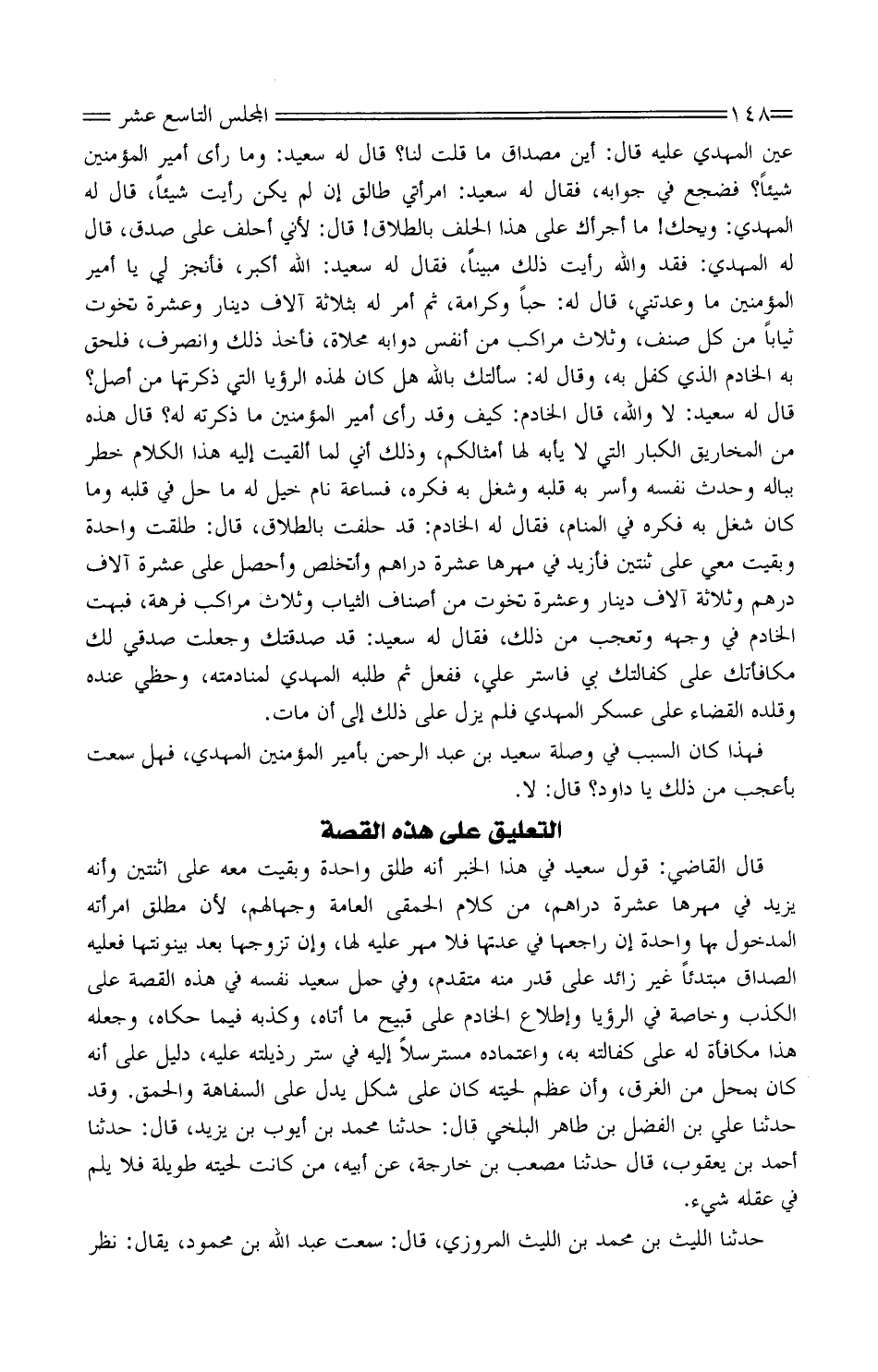 عين الْمهْدي عَلَيْهِ قَالَ: أَيْنَ مصداق مَا قلت لَنَا؟ قَالَ لَهُ سَعِيد: وَمَا رَأْي أَمِير الْمُؤمنِينَ شَيئًا؟ فضجع فِي جَوَابه، فَقَالَ لَهُ سَعِيد: امْرَأَتي طَالِق إِن لَمْ يكن رأيتَ شَيئًا، قَالَ لَهُ الْمهْدي: وَيحك! مَا أجرأك عَلَى هَذَا الْحلف بِالطَّلَاق! قَالَ: لِأَنِّي أَحْلف عَلَى صِدْق، قَالَ لَهُ المهديُّ: فقد وَالله رَأَيْت ذَلِكَ مُبينًا، فَقَالَ لَهُ سَعِيد: اللَّه أكبر، فأنجز لي يَا أَمِير الْمُؤمنِينَ مَا وَعَدتنِي، قَالَ لَهُ: حُبًّا وكرامة، ثُمَّ أَمر لَهُ بِثَلَاثَة آلَاف دِينَار وَعشرَة تخوت ثيابًا من كلّ صنف، وَثَلَاث مراكب من أنفس دوابّه مُحلاة، فَأخذ ذَلِكَ وَانْصَرف، فلحق بِهِ الْخَادِم الَّذِي كفل بِهِ، وَقَالَ لَهُ: سألتُك بِاللَّه هَلْ كَانَ لهَذِهِ الرُّؤْيَا الَّتِي ذكرتَها من أصل؟ قَالَ لَهُ سَعِيد: لَا وَالله، قَالَ الْخَادِم: كَيْفَ وَقد رَأَى أَمِير الْمُؤمنِينَ مَا ذكرتَه لَهُ؟ قَالَ هَذِهِ من المخاريق الْكِبَار الَّتِي لَا يأبه لَهَا أمثالكم، وَذَلِكَ أَنِّي لمّا ألقيت إِلَيْهِ هَذَا الْكَلَام خطر بِبَالِهِ وَحدث نَفسه وَأسر بِهِ قلبه وشغل بِهِ فكره، فساعة نَام خُيِّل لَهُ مَا حَلَّ فِي قلبه وَمَا كَانَ شغل بِهِ فكره فِي الْمَنَام، فَقَالَ لَهَ الْخَادِم: قَدْ حلفتَ بِالطَّلَاق، قَالَ: طلقت وَاحِدَة وَبقيت معي عَلَى ثِنْتين فأزيدُ فِي مهرهَا عشرَة دَرَاهِم وأتخلّص وأحصل عَلَى عشرَة آلَاف دِرْهَم وَثَلَاثَة آلَاف دِينَار وَعشرَة تخوت من أَصْنَاف الثِّيَاب وَثَلَاث مراكب فرهة، فبهت الْخَادِم فِي وَجهه وتعجّب من ذَلِكَ، فَقَالَ لَهُ سَعِيد: قَدْ صَدَقْتُك وَجعلت صِدقي لَك مكافأتك عَلَى كفالتك بِي فاسْتُر عليّ، فَفعل ثُمَّ طلبه المهديُّ لمنادمته، وحَظِيَ عِنْدَهُ وقَلّده القضاءَ عَلَى عَسْكَر المهديّ فَلم يزل على ذَلِكَ إِلَى أَن مَاتَ.