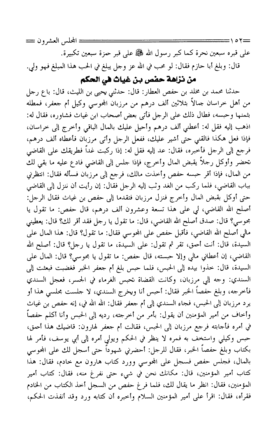 حَدَّثَنَا مُحَمَّد بْن مخلد بن حَفْص حَفْص العَطَّار: قَالَ: حَدَّثَنِي يحيى ابْن اللَّيْث، قَالَ: بَاعَ رَجُل من أَهْلَ خُرَاسَان جمالا بِثَلَاثِينَ ألف دِرْهَم من مَرْزُبان المجوسيِّ وَكيل أم جَعْفَر، فمطله بِثمنِهَا وحبسه، فطال ذَلِكَ عَلَى الرَّجُل فَأتى بَعْض أَصْحَاب ابْن غياث فشاوره، فَقَالَ لَهُ: اذْهَبْ إِلَيْهِ فَقل لَهُ: أَعْطِنِي ألف دِرْهَم وأحيلُ عَلَيْكَ بِالْمَالِ الْبَاقِي وأخرجُ إِلَى خُراسان، فَإِذا فعل هَكَذَا فالقني حَتَّى أُشير عَلَيْكَ، فَفعل الرَّجُل وأتى مرزبان فَأعْطَاهُ ألف دِرْهَم، فَرجع إِلَى الرَّجُل فَأخْبرهُ، فَقَالَ: عُد إِلَيْهِ فَقل لَهُ: إِذَا ركبت غَدا فطريقُك عَلَى القَاضِي تَحْضُرُ وأوكِّل رَجُلا يقبض المَال وَأخرج، فَإِذا جلس إِلَى القَاضِي فادِّع عَلَيْهِ مَا بَقِي لَك من المَال، فَإِذا أقرّ حَبسه حَفْص وَأخذت مَالك، فَرجع إِلَى مرزبان فَسَأَلَهُ فَقَالَ: انتظرني بِبَاب القَاضِي، فَلَمّا ركب من الْغَد وثب إِلَيْهِ الرَّجُل فَقَالَ: إِن رَأَيْت أَن ننزل إِلَى القَاضِي حَتَّى أوكِّل بِقَبض المَال وَأخرج فَنزل مرزبان فتقدَّما إِلَى حَفْص بْن غياث فَقَالَ الرَّجُل: أصلح اللَّه القَاضِي، لي عَلَى هَذَا تِسْعَة وَعِشْرُونَ ألف دِرْهَم، قَالَ حَفْص: مَا تَقول يَا مجوسيُّ؟ قَالَ: صَدَق أصلَح اللَّه القَاضِي، قَالَ: مَا تقولُ يَا رَجُل فقد أقرّ لَك؟ قَالَ: يُعطيني مَالِي أصلح اللَّه القَاضِي، فَأقبل حَفْص عَلَى الْمَجُوسِيّ فَقَالَ: مَا تَقول؟ قَالَ: هَذَا المَال عَلَى السيدة، قَالَ: أَنْت أَحمَق، تقرُّ ثُمَّ تَقول: عَلَى السيدة، مَا تَقول يَا رَجُل؟ قَالَ: أصلح اللَّه القَاضِي، إِن أَعْطَانِي مَالِي وَإِلَّا حبستَه، قَالَ حَفْص: مَا تَقول يَا مجوسيّ؟ قَالَ: المالُ عَلَى السيدة، قَالَ: خُذُوا بِيَدِهِ إِلَى الْحَبْس، فَلَمّا حُبس بلغ أم جَعْفَر الْخَبَر فَغضِبت فَبعثت إِلَى السِّنْدي: وَجِّه إليَّ مرزبان، وَكَانَت الْقُضاة تَحبس الْغُرَمَاء فِي الْجِسر، فعَجِلَ السِّنْدي فَأخْرجهُ، وَبلغ حفصًا الْخَبَر فَقَالَ: أَحْبِسُ أَنَا ويُخرِج السِّنْدي، لَا جَلَست مجلسي هَذَا أَوْ يُردُّ مرزبان إِلَى الْحَبْس، فجَاء السندي إِلَى أم جَعْفَر فَقَالَ: اللَّه اللَّه فِي، أَنه حَفْص بْن غياث وأخاف من أَمِير الْمُؤمنِينَ أنْ يَقُولُ: بِأَمْر من أخرجته، رُدِّيهِ إِلَى الْحَبْس وَأَنا أكَلمُ حفصًا فِي أمره فأجابته فَرجع مرزبان إِلَى الْحَبْس، فَقَالَت أم جَعْفَر لهارون: قاضيك هَذَا أَحمَق، حبس وَكيلِي واستَخف بِهِ فمرهُ لَا ينظر فِي الحكم ويولي أمره إِلَى أَبِي يُوسُف، فَأمر لَهَا بِكِتَاب وَبلغ حفصًا الْخَبَر، فَقَالَ للرجل: أحضرني شُهودًا حَتَّى أُسَجِّلَ لَك عَلَى المجوسيِّ بِالْمَالِ، فَجَلَسَ حَفْص فسجّل عَلَى الْمَجُوسِيّ وَورد كتاب هَارُون مَعَ خَادِم، فَقَالَ: هَذَا كتاب أَمِير الْمُؤمنِينَ، قَالَ: مَكَانك نَحْنُ فِي شَيْءٍ حَتَّى نَفرُغ مِنْهُ، فَقَالَ: كتاب أَمِير الْمُؤمنِينَ، فَقَالَ: انْظُر مَا يُقَالُ لَك، فَلَمّا فرغ حَفْص من السِّجل أَخذ الْكتاب من الْخَادِم فقرأه، فَقَالَ: اقْرَأ عَلَى أَمِير الْمُؤمنِينَ السّلام وَأخْبرهُ أنَّ كِتَابه ورد وَقد أنفذْتُ الحكم،