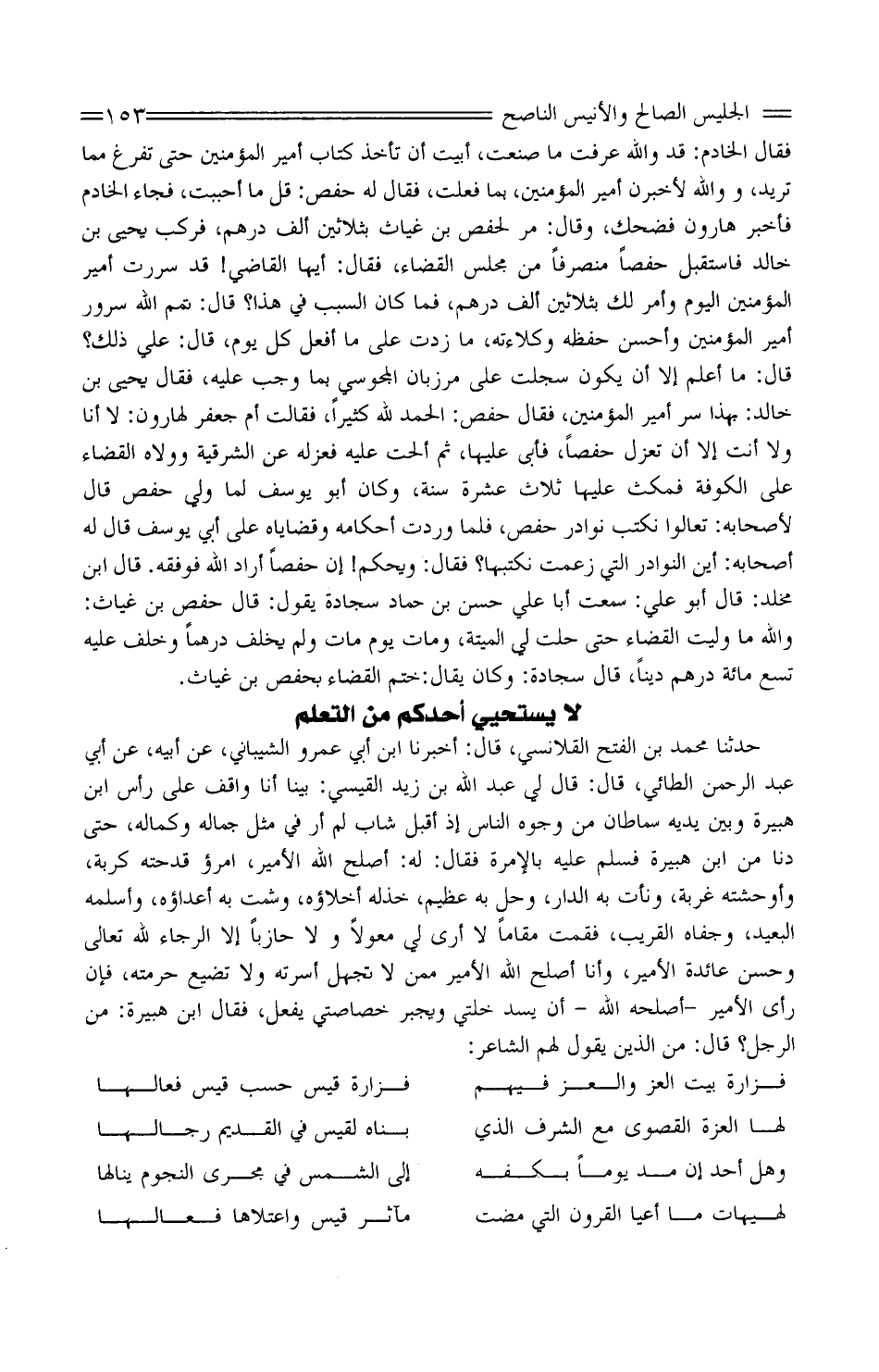 حَدَّثَنَا مُحَمَّد بْن الْفَتْح القلانسي، قَالَ: أَخْبَرَنَا ابْن أبي عَمْرو الشَّيْبَانيّ، عَنْ أَبِيه، عَنْ أبي عَبْد الرَّحْمَن الطَّائِي، قَالَ: قَالَ لي عَبْد اللَّه بْن زَيْدُ القَيْسيّ: بَينا أَنَا وَاقِف عَلَى رَأس ابْن هُبَيْرة وَبَين يَدَيْهِ سِمَاطَانِ من وُجُوه النّاس إِذْ أقبل شَاب لَمْ أر فِي مثل جماله وكماله، حَتَّى دنا من ابْن هُبَيْرة فَسلم عَلَيْهِ بالإمرة فَقَالَ: لَهُ: أصلح اللَّه الْأَمِير، امرؤٌ قدحته كُربة، وأوحشته غُربة، ونأتْ بِهِ الدَّار، وَحل بِهِ عَظِيم، خَذَله أخلاؤُه، وشمت بِهِ أعداؤه، وأسلمه الْبعيد، وجفاه الْقَرِيب، فَقُمْت مقَاما لَا أرى لي مُعَولا ولَا حازبا إِلَّا الرَّجَاء لله تَعَالَى وحُسن عَائدة الْأَمِير، وَأَنا أصلح اللَّه الْأَمِير مِمَّن لَا تُجهل أسرته وَلَا تضيع حرمته، فَإِن رَأَى الْأَمِير - أصلحه اللَّه - أَن يسدَّ خَلتي وَيجْبر خصاصتي يفعل، فَقَالَ ابْن هُبَيْرة: مَنِ الرَّجُل؟ قَالَ: من الَّذِينَ يَقُولُ لَهُم الشَّاعِر: