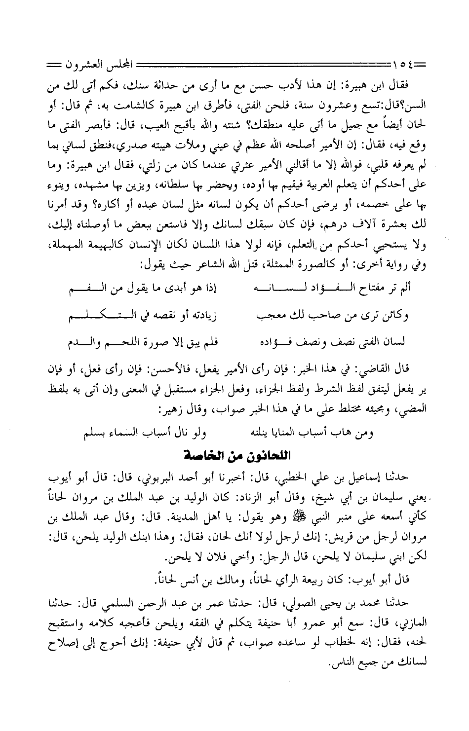 فَقَالَ ابْن هُبَيْرة: إِن هَذَا لأدبٌ حَسَنٌ مَعَ مَا أرى من حَداثة سنك، فكم أَتَى لَك من السن؟ قَالَ: تسع وَعِشْرُونَ سنة، فلحن الْفَتى، فَأَطْرَقَ ابْن هُبَيْرة كالشامت بِهِ، ثُمَّ قَالَ: أَو لَحّان أَيْضا مَعَ جميل مَا أَتَى عَلَيْهِ منطقك؟ شِنْتَه وَالله بأقبح الْعَيْب، قَالَ: فأبصر الْفَتى مَا وَقع فِيهِ، فَقَالَ: إِن الْأَمِير أصلحه اللَّه عظُم فِي عَيْني وملأت هيبته صَدْرِي، فَنَطَقَ لساني بِمَا لَمْ يعرفهُ قلبِي، فوَاللَّه إِلَّا مَا أقالني الْأَمِير عثرتي عِنْدَمَا كَانَ من زلتي، فَقَالَ ابْن هُبَيْرة: وَمَا عَلَى أَحَدكُمْ أَن يتَعَلَّم الْعَرَبيَّة فيقيم بهَا أوَدَه، ويَحْضُرَ بهَا سُلْطَانَه، ويُزَيّن بهَا مشهده، وينوءَ بهَا عَلَى خصمة، أَوَ يَرْضَى أَحَدُكُمْ أَن يكون لِسَانه مثل لِسَان عَبده أَوْ أكّاره؟ وَقد أمرنَا لَك بِعشْرَة آلَاف دِرْهَم، فَإِن كَانَ سَبَقَك لسَانك وَإِلَّا فَاسْتَعِنْ بِبَعْض مَا أوصلناه إِلَيْك، وَلَا يستحيي أَحَدُكُمْ من التَّعَلُّم، فَإِنَّهُ لَوْلَا هَذَا اللِّسَان لَكَانَ الإِنْسَان كالبهيمة الْمُهْملَة، وَفِي رِوَايَة أُخْرَى: أَوْ كالصورة الممثلة، قتل اللَّه الشَّاعِر حَيْث يَقُولُ: