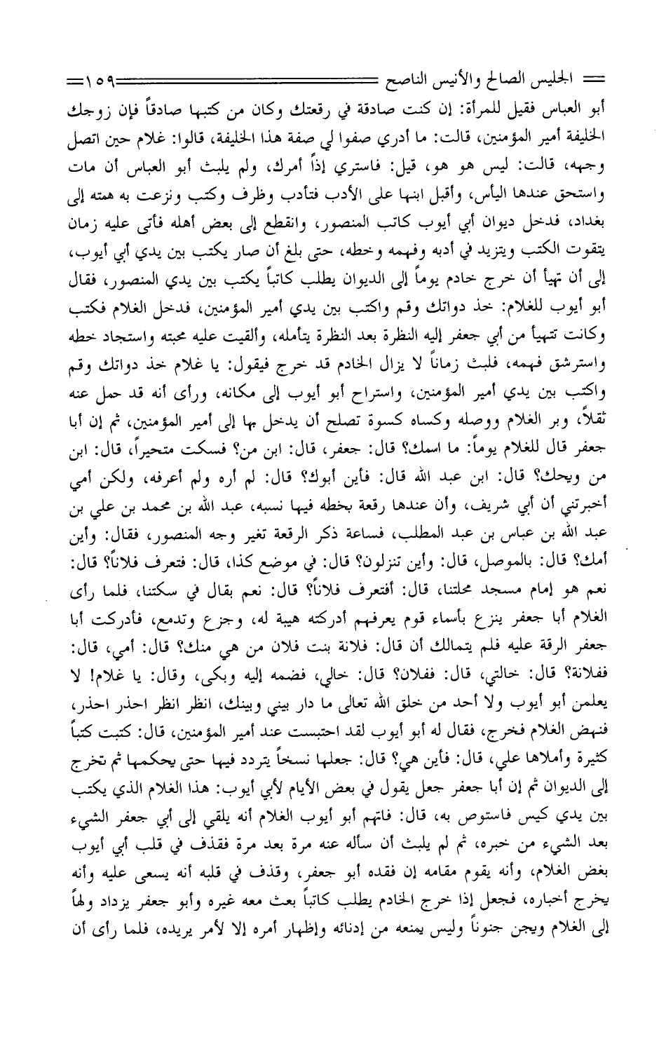أَبُو الْعَبَّاس فَقيل للْمَرْأَة: إِن كنت صَادِقَة فِي رقعتك وَكَانَ من كتبهَا صَادِقا فَإِن زَوجك الْخَلِيفَة أَمِير الْمُؤمنِينَ، قَالَتْ: مَا أَدْرِي صفوا لي صفة هَذَا الْخَلِيفَة، قَالُوا: غلامٌ حِين اتَّصل وَجهه، قَالَتْ: لَيْسَ هُوَ هُوَ، قيل: فاستري إِذَا أَمرك، وَلم يلبث أَبُو الْعَبَّاس أَن مَاتَ وَاسْتحق عِنْدهَا الْيَأْس، وَأَقْبل ابْنهَا عَلَى الْأَدَب فتأدب وظَرُفَ وَكتب ونزعت بِهِ همته إِلَى بَغْدَاد، فَدخل ديوَان أبي أَيُّوب كَاتب الْمَنْصُور، وَانْقطع إِلَى بَعْض أَهله فَأتى عَلَيْهِ زمَان يتقَّوت الْكتب ويتزيد فِي أدبه وفهمه وخطه، حَتَّى بلغ إِن صَار يكْتب بَيْنَ يَدي أبي أَيُّوب، إِلَى أَن تهَيَّأ أَن خرج خَادِم يَوْمَا إِلَى الدِّيوَان يطْلب كَاتبا يكْتب بَيْنَ يَدي الْمَنْصُور، فَقَالَ أَبُو أَيُّوب للغلام: خُذْ دَوَاتَك وقم واكتب بَيْنَ يَدي أَمِير الْمُؤمنِينَ، فَدخل الغلامُ فَكتب وَكَانَت تتهيأ من أبي جَعْفَر إِلَيْهِ النظرة بَعْدَ النظرة يتأمله، وألقيت عَلَيْهِ محبته واستجاد خطه واسترشق فهمه، فَلبث زَمَانا لَا يزَال الْخَادِم قَدْ خَرَجَ فيَقُولُ: يَا غُلَام خُذ دواتك وقم واكتب بَيْنَ يَدي أَمِير الْمُؤمنِينَ، واستراح أَبُو أَيُّوب إِلَى مَكَانَهُ، وَرَأى أَنَّهُ قَدْ حَمَل عَنْهُ ثقلا، وبرَّ الغلامَ وَوَصله وكساه كُسْوةً تصلح أَن يَدْخُل بهَا إِلَى أَمِير الْمُؤمنِينَ، ثُمَّ إِن أَبَا جَعْفَر قَالَ للغلام يَوْمَا: مَا اسْمك؟ قَالَ: جَعْفَر، قَالَ: ابْن من؟ فَسكت متحيرًا، قَالَ: ابْن من وَيحك؟ قَالَ: ابْن عَبْد اللَّه قَالَ: فَأَيْنَ أَبوك؟ قَالَ: لَمْ أره وَلم أعرفهُ، وَلَكِن أُمِّي أَخْبَرتنِي أَن أبي شرِيف، وَأَن عِنْدَها رقْعَة بِخَطِّهِ فِيهَا نسبه، عَبْد اللَّه بْن مُحَمَّد بْن عليّ بْن عَبْد اللَّه بْن عَبَّاس بْن عَبْد الْمطلب، فساعة ذَكَرَ الرقعة تغير وَجه الْمَنْصُور، فَقَالَ: وَأَيْنَ أمك؟ قَالَ: بالموصل، قَالَ: وَأَيْنَ تَنْزِلُونَ؟ قَالَ: فِي مَوضِع كَذَا، قَالَ: فتعرفُ فلَانا؟ قَالَ: نَعَمْ هُوَ إِمَام مَسْجِد مَحَلّتنا، قَالَ: أفتعرف فلَانا؟ قَالَ: نَعَمْ بَقّالٌ فِي سكتنا، فَلَمّا رَأَى الْغُلَام أَبَا جَعْفَر ينْزع بأسماء قَوْمٍ يعرفهُمْ أَدْرَكته هيبةٌ لَهُ، وجَزَع وتَدَمّعَ، فأدركت أَبَا جَعْفَر الرقة عَلَيْهِ فَلم يَتَمَالَك أَن قَالَ: فُلَانَة بِنْت فلَان من هِيَ مِنْك؟ قَالَ: أُمِّي، قَالَ: ففلانة؟ قَالَ: خَالَتِي، قَالَ: ففلان؟ قَالَ: خَالِي، فضمه إِلَيْهِ وَبكى، وَقَالَ: يَا غُلَام! لَا يعلمنّ أَبُو أَيُّوب وَلَا أحد من خَلْقٌ اللَّه تَعَالَى مَا دَار بيني وبنيك، انْظُر انْظُر احذر احذر، فَنَهَضَ الْغُلَام فَخرج، فَقَالَ لَهُ أَبُو أَيُّوب لَقَد احتبستَ عِنْدَ أَمِير الْمُؤمنِينَ، قَالَ: كتبتُ كتبا كَثِيرَة وأملّها عَلَي، قَالَ: فَأَيْنَ هِيَ؟ قَالَ: جعلهَا نسخا يتردَّدُ فِيهَا حَتَّى يُحْكمها ثُمَّ تخرج إِلَى الدِّيوَان ثُمَّ إِن أَبَا جَعْفَر جعل يَقُولُ فِي بَعْض الْأَيَّام لأبي أَيُّوب: هَذَا الْغُلَام الَّذِي يكْتب بَيْنَ يَدي كيس فاستوص بِهِ، قَالَ: فاتّهم أَبُو أَيُّوب الْغُلَام أَنه يلقِي إِلَى أبي جَعْفَر الشَّيء بَعْدَ الشَّيء من خَبره، ثُمَّ لَمْ يلبث أَن سَأَلَهُ عَنْهُ مرّة بَعْدَ مرّة فقُذِف فِي قلب أبي أَيُّوب بُغْضُ الْغُلَام، وَأَنه يقوم مقَامه إِن فَقده أَبُو جَعْفَر، وَقذف فِي قلبه أَنَّهُ يسْعَى عَلَيْهِ وَأَنه يخرج أخباره، فَجعل إِذَا خَرَجَ الْخَادِم يطْلب كَاتبا بعث مَعَه غَيره وَأَبُو جَعْفَر يزْدَاد وَلها إِلَى الْغُلَام ويجن جنونًا وَلَيْسَ يمنعهُ من إدنائه وَإِظْهَار أمره إِلَّا لأمر يَريده، فَلَمّا رَأَى أنَّ