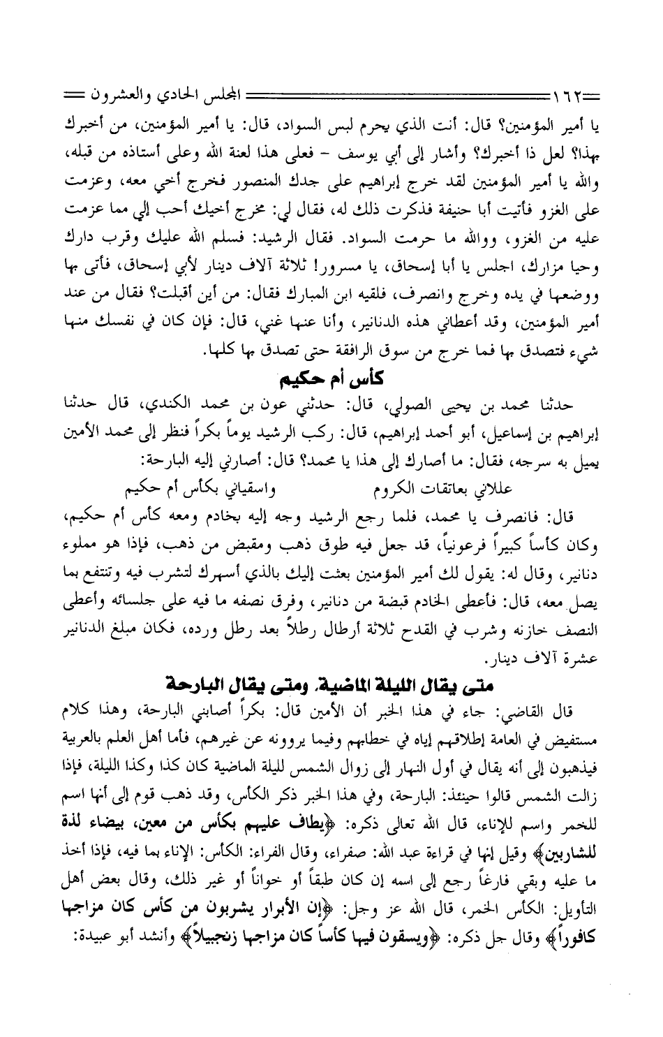 قَالَ القَاضِي: جَاءَ فِي هَذَا الْخَبَر أنَّ الْأمين قَالَ: بَكِرًا أصابني البارحة، وَهَذَا كَلَام مستفيض فِي الْعَامَّة إِطْلَاقهم إِيَّاه فِي خطابهم وَفِيمَا يَرْوُونَهُ عَنْ غَيرهم، فَأَما أَهْلَ الْعلم بِالْعَرَبِيَّةِ فيذهبون إِلَى أَنَّهُ يُقَالُ فِي أَوْل النَّهَار إِلَى زَوَال الشَّمْسُ لليلة الْمَاضِيَة كَانَ كَذَا وَكَذَا اللَّيْلَة، فَإِذا زَالَت الشَّمْسُ قَالُوا حِينَئِذٍ: البارحة، وَفِي هَذَا الْخَبَر ذَكَرَ الكأس، وَقد ذهب قَوْمٍ إِلَى أَنَّهَا اسْم للخمر وَاسم للإناء، قَالَ اللَّه تَعَالَى ذكره: " يُطَافُ عَلَيْهِمْ بِكَأْسٍ مِنْ مَعِينٍ، بَيْضَاءَ لَذَّةٍ لِلشَّارِبِينَ " وَقيل إِنَّها فِي قِرَاءَة عَبْد اللَّه: صفراء، وَقَالَ الْفراء: الكأس: الْإِنَاء بِمَا فِيهِ، فَإِذا أَخذ مَا عَلَيْهِ وَبَقِي فَارغًا رَجَعَ إِلَى اسْمه إِن كَانَ طَبَقًا أَوْ خُوَانًا أَوْ غَيْر ذَلِكَ، وَقَالَ بَعْض أَهْلَ التَّأْوِيل: الكأس الْخمر، قَالَ الله عَزَّ وَجَلَّ: " إِنَّ الأَبْرَارَ يَشْرَبُونَ مِنْ كَأْسٍ كَانَ مزاجها كافوراً " وَقَالَ جلَّ ذكره: " وَيُسْقَوْنَ فِيهَا كأساً كَانَ مزاجها زنجبيلاً " وَأنْشد أَبُو عُبَيْدة:
