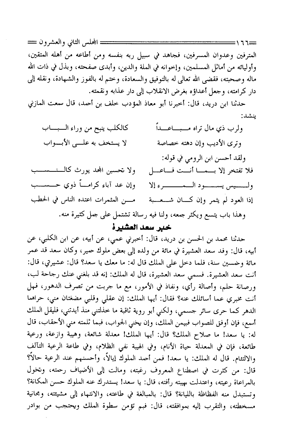حَدَّثَنَا مُحَمَّد بْن الْحَسَن بْن دُرَيْد، قَالَ: أَخْبرنِي عمي، عَنْ أَبِيه، عَنِ ابْن الْكَلْبِيّ، عَنْ أَبِيه، قَالَ: وَفَدَ سعدُ الْعَشِيرَة فِي مائَة من وَلَده إِلَى بَعْض مُلُوك حِمْير، وَكَانَ سعدٌ قَدْ عُمّر مائَة وَخمسين سنة، فَلَمّا دَخَلَ عَلَى الْملك قَالَ لَهُ: مَا مَعَك يَا سَعْد؟ قَالَ: عشيرتي، قَالَ: أَنْت سَعْدُ الْعَشِيرَة. فَسُمِّيَ سَعْد الْعَشِيرَة، قَالَ لَهُ الْملك: إِنَّهُ قَدْ بَلغنِي عَنْكَ رجاحةُ لُبِّ، ورصانةُ حِلم، وأصالة رَأْي، ونفاذٌ فِي الْأُمُور، مَعَ مَا جَرّبت من تصرف الدُّهور، فَهَل أَنْت مخبري عَمَّا أسائِلُك عَنْهُ؟ فَقَالَ: أَيهَا الْملك: إِن عَقْلِي وقلبي مضغتان مني، حَرَاهما الدَّهْر كَمَا حَرَى سَائِر جسمي، وَلَكِنِّي أَبُو روية ثاقبة مَا خذلتني مُنْذُ أيدتني، فَلْيقل الْملك أسمع، فَإِن أوفّق للصَّوَاب فبِيُمْنِ الْملك، وَإِن يَخُنِّي الجوابُ، فبمَا ثَلَمَتْهُ مِنِّيَ الأحْقابُ، قَالَ لَهُ: يَا سَعْد! مَا صلاحُ الْملك؟ قَالَ: أَيهَا الْملك! مَعْدَلةٌ شائعة، وهيبة وازعة، ورعية طَائِعَة، فَإِن فِي المعدَلة حَيَاة الْأَنَام، وَفِي الهيبة نفي الظلام، وَفِي طَاعَة الرّعية التآلف والالتئام. قَالَ لَهُ الْملك: يَا سَعْد! فَمن أَحْمَدُ الْمُلُوك إيَالا، وَأَحْسَنهمْ عِنْدَ الرّعية حَالا؟ قَالَ: من كثرتْ فِي اصطناع الْمَعْرُوف رغبته، ومالت إِلَى الأضياف رَحمته، وتخول بالمراعاة رَعيته، واعتدلت بهيبته رأفته، قَالَ: يَا سَعْد! يُسْتَدرك عَنْهُ الْمُلُوك حُسْنُ المكانة؟ وتُستبدل مِنْهُ الفظاظة بالليانة؟ قَالَ: بالمبالغة فِي طَاعَته، والانتهاء إِلَى مَشِيئَته، ومجانية مسخطته، والتقرب إِلَيْهِ بموافقته، قَالَ: فَبِمَ تُؤْمَن سطوة الْملك ويُحتجب من بَوَادِر