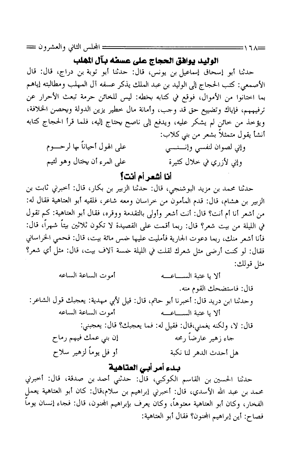 حَدَّثَنَا مُحَمَّد بْن مزِيد البوشنجي، قَالَ: حَدَّثَنَا الزُّبَيْر بْن بكار، قَالَ: أَخْبرنِي ثَابت بْن الزُّبَيْر بْن هِشَام، قَالَ: قَدِمَ الْمَأْمُون من خُرَاسَان وَمَعَهُ شَاعِر، فَلَقِيَهُ أَبُو الْعَتَاهِيَة فَقَالَ لَهُ: من أشعر أَنَا أم أَنْت؟ قَالَ: أَنْت أشعر وَأولى بالتقدمة ووقّره، فَقَالَ أَبُو الْعَتَاهِيَة: كم تَقول فِي اللَّيْلَة من بَيت شعر؟ قَالَ: رُبمَا أَقمت عَلَى القصيدة لَا تكون ثَلَاثِينَ بَيْتا شهرا، قَالَ: فَأَنا أشعر مِنْك، رُبمَا دَعَوْت الْجَارِيَة فأمليتُ عَلَيْهَا خمس مائَة بَيت، قَالَ: فحمي الْخُرَاساني فَقَالَ: لَوْ كنت أرْضى مِثل شِعرك لقلتُ فِي اللَّيْلَة خَمْسَة آلَاف بَيت، قَالَ: مثل أَي شعر؟ مثل قَوْلك: