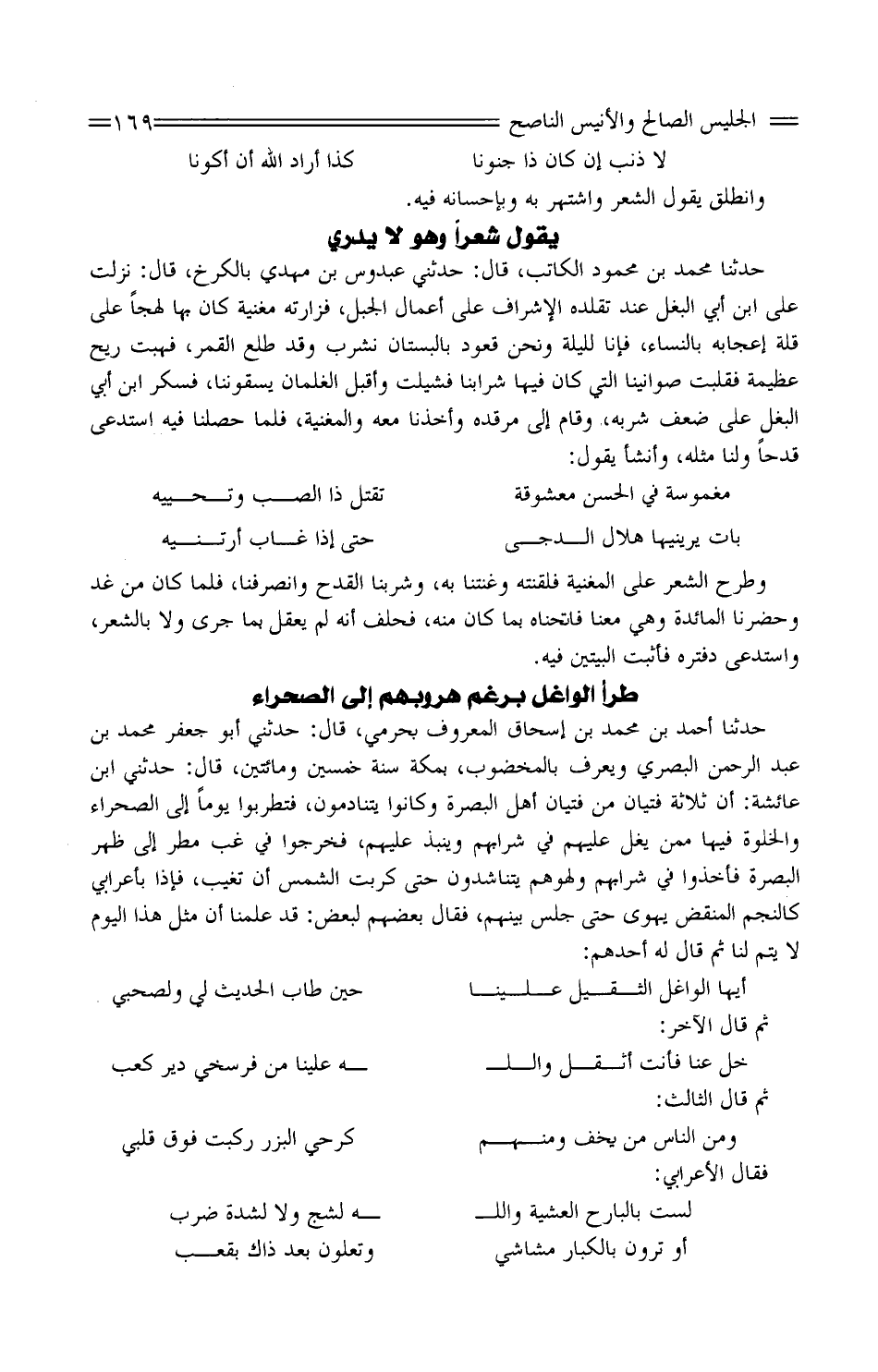 حَدَّثَنَا أَحْمَد بْن مُحَمَّد بْن إِسْحَاق الْمَعْرُوف بحرمي، قَالَ: حَدَّثَنِي أَبُو جَعْفَر مُحَمَّد بْن عبد الرَّحْمَن الْبَصْرِيّ وَيعرف بالمخضوب، بِمَكَّة سنة خمسين وَمِائَتَيْنِ، قَالَ: حَدثنِي ابْن عَائِشَة: أنَّ ثَلَاثَة فتيَان من فتيَان أَهْلَ الْبَصْرَة وَكَانُوا يتنادمون، فتطربوا يَوْمَا إِلَى الصَّحرَاء وَالْخلْوَة فِيهَا مِمَّن يَغُلُّ عَلَيْهِمْ فِي شرابهم ويَنْبذ عَلَيْهِمْ، فَخَرجُوا فِي غِبِّ مطرٍ إِلَى ظهر الْبَصْرَة فَأخذُوا فِي شرابهم ولهوهم يتناشدون حَتَّى كَرُبَت الشَّمْسُ أَن تغيب، فَإِذا بأعرابي كالنجم المنقض يهوى حَتَّى جلس بَينهم، فَقَالَ بَعضهم لبَعض: قَدْ علمنَا أنَّ مثل هَذَا الْيَوْم لَا يتم لَنَا ثُمَّ قَالَ لَهُ أحدهم: