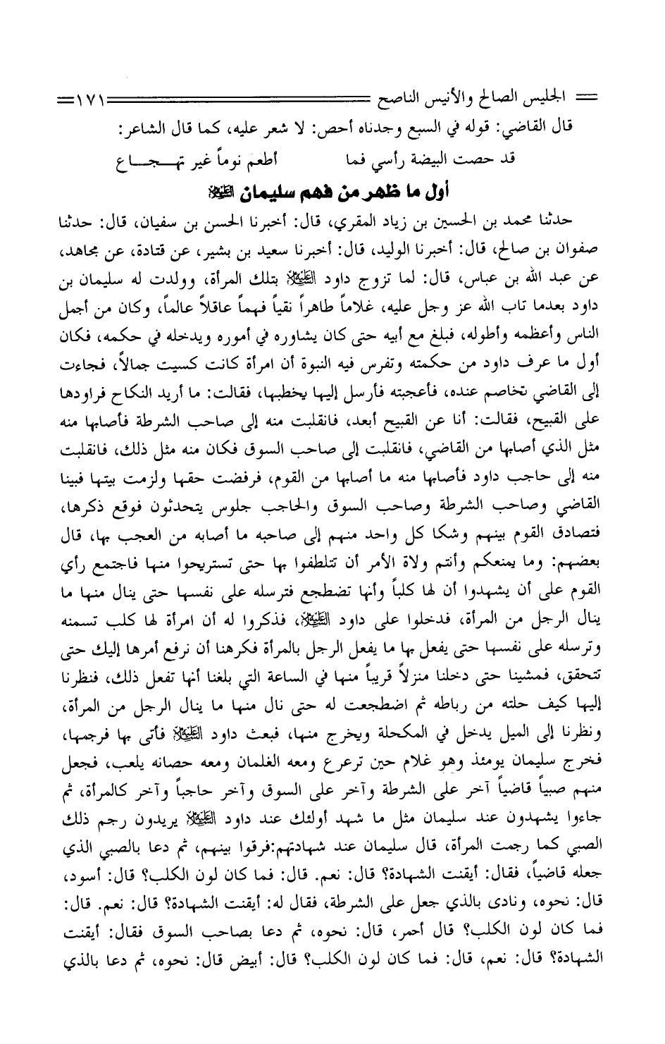 حَدَّثَنَا مُحَمَّد بْن الْحُسَيْن بْن زِيَاد الْمقري، قَالَ: أَخْبَرَنَا الْحَسَن بْن سُفْيَان، قَالَ: حَدَّثَنَا صَفْوَان بْن صَالح، قَالَ: أَخْبَرَنَا الْوَلِيد، قَالَ: أَخْبَرَنَا سَعِيد بْن بشير، عَنْ قَتَادَةَ، عَنْ مُجَاهِد، عَنْ عَبْد اللَّه بْن عَبَّاس، قَالَ: لمّا تزوج دَاوُد عَلَيْهِ السّلام بِتِلْكَ الْمَرْأَة، وولدتْ لَهُ سُلَيْمَان بْن دَاوُد بَعْدَمَا تَابَ الله عَزَّ وَجَلَّ عَلَيْهِ، غُلَاما طَاهِرا نقيًا فهما عَاقِلا عَالما، وَكَانَ من أجمل النّاس وأعظمه وأطوله، فَبلغ مَعَ أَبِيهِ حَتَّى كَانَ يشاوره فِي أُمُوره ويدخله فِي حكمه، فَكَانَ أول مَا عرف دَاوُد من حكمته وتفرس فِيهِ النُّبُوة أنَّ امْرَأَة كَانَتْ كُسِيت جمالا، فَجَاءَت إِلَى القَاضِي تخاصمُ عِنْدَهُ، فَأَعْجَبتهُ فَأرْسل إِلَيْهَا يخطبها، فَقَالَت: مَا أُرِيد النِّكَاح فَرَاوَدَهَا عَلَى الْقَبِيح، فَقَالَت: أَنَا عَنِ الْقَبِيح أبعد، فَانْقَلَبت مِنْهُ إِلَى صَاحب الشرطة فأصابها مِنْهُ مثل الَّذِي أَصَابَهَا من القَاضِي، فَانْقَلَبت إِلَى صَاحب السُّوق فَكَانَ مِنْهُ مثل ذَلِك، فَانْقَلَبت مِنْهُ إِلَى حَاجِب دَاوُد فأصابها مِنْهُ مَا أَصَابَهَا من الْقَوْم، فرفضت حَقّهَا ولزمت بَيتهَا فَبينا القَاضِي وَصَاحب الشرطة وَصَاحب السُّوق والحاجب جُلُوس يتحدثون فَوَقع ذكرهَا، فتصادق القوم بَينهم وشَكَا كلُّ وَاحِد مِنْهُم إِلَى صَاحبه مَا أَصَابَهُ من الْعجب بهَا، قَالَ بَعضهم: وَمَا يمنعكم وَأَنْتُم وُلَاة الْأَمر أَن تتلطفوا بهَا حَتَّى تستريحوا مِنْهَا فَاجْتمع رأيُ الْقَوْم عَلَى أَن يشْهدُوا أنَّ لَهَا كَلْبًا وَأَنَّهَا تضطجع فترسله عَلَى نَفسهَا حَتَّى ينَال مِنْهَا مَا ينَال الرَّجُل من الْمَرْأَة، فَدَخَلُوا عَلَى دَاوُد عَلَيْهِ السّلام، فَذكرُوا لَهُ أنَّ امْرَأَة لَها كلب تُسَمِّنُه وترسله عَلَى نَفسهَا حَتَّى يفعل بهَا مَا يفعل الرَّجُل بِالْمَرْأَةِ فكرهنا أَن نرفع أمرهَا إِلَيْكَ حَتَّى تَتَحقّق، فمشينا حَتَّى دَخَلنَا منزلا قَرِيبا مِنْهَا فِي السَّاعَة الَّتِي بلغنَا أَنَّهَا تفعل ذَلِكَ، فَنَظَرْنَا إِلَيْهَا كَيْفَ حَلّتْه من رباطه ثُمَّ اضطجعت لَهُ حَتَّى نَالَ مِنْهَا مَا ينَال الرَّجُل من الْمَرْأَة، ونظرنا إِلَى الميلِ يدْخل فِي الْمُكْحلة وَيخرج مِنْهَا، فَبعث دَاوُد عَلَيْهِ السّلام فَأتى بهَا فرجَمَها، فَخرج سُلَيْمَان يَوْمئِذٍ وَهُوَ غلامٌ حِين ترعرع وَمَعَهُ الغلمان وَمَعَهُ حصانه يلْعَب، فَجعل مِنْهُم صَبيا قَاضِيا آخر عَلَى الشرطة وَآخر عَلَى السُّوق وَآخر حاجبًا وَآخر كَالْمَرْأَةِ، ثُمَّ جَاءُوا يشْهدُونَ عِنْدَ سُلَيْمَان مثل مَا شهد أُولَئِكَ عِنْدَ دَاوُد عَلَيْهِ السّلام يريدونَ رَجْم ذَلِكَ الصَّبِي كَمَا رُجِمَت الْمَرْأَة، قَالَ سُلَيْمَان عِنْدَ شَهَادَتهم: فَرِّقُوا بَينهم، ثُمَّ دَعَا بِالصَّبِيِّ الَّذِي جعله قَاضِيا، فَقَالَ: أيقنت الشَّهَادَة؟ قَالَ: نَعَمْ. قَالَ: فَمَا كَانَ لَوْن الْكَلْب؟ قَالَ: أسود، قَالَ: نَحُّوه، ونادى بِالَّذِي جعل على الشرطة، فَقَالَ لَهُ: أيقنت الشَّهَادَة؟ قَالَ: نَعَمْ. قَالَ: فَمَا كَانَ لَوْن الْكَلْب؟ قَالَ أَحْمَر، قَالَ: نَحُّوه، ثُمَّ دَعَا بِصَاحِب السُّوق فَقَالَ: أيقنت الشَّهَادَة؟ قَالَ: نَعَمْ، قَالَ: فَمَا كَانَ لون الْكَلْب؟ قَالَ: أَبيض قَالَ: نَحُّوه، ثُمَّ دَعَا بِالَّذِي
