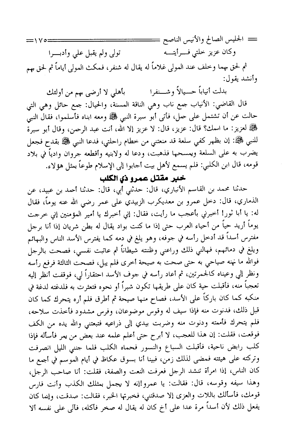 حَدَّثَنَا مُحَمَّد بْن القَاسِم الأنبَاريّ، قَالَ: حَدَّثَنِي أبي، قَالَ: حَدَّثَنَا أَحْمَد بْن عُبَيْد، عَنِ الذمارِي، قَالَ: دَخَلَ عَمْرو بْن معدي كرب الزَّبِيديّ عَلَى عُمَر رَضِيَ اللَّه عَنْهُ يَوْمَا، فَقَالَ لَهُ: يَا أَبَا ثَوْر! أَخْبرنِي بِأَعْجَب مَا رَأَيْت، فَقَالَ: إِنِّي أخْبرك يَا أَمِير الْمُؤمنِينَ أَنِّي خرجت يَوْمَا أُرِيد حَيا من أَحيَاء الْعَرَب حَتَّى إِذَا مَا كنت بواد يُقَالُ لَهُ بطن شريان إِذَا أَنَا بِرَجُل مفترس أسدًا قَدْ أَدخل رَأسه فِي جَوْفه، وَهُوَ يلغ فِي دَمه كَمَا يفترس الْأسد النّاس والبهائم ويلغ فِي دِمَائِهِمْ، فهالني ذَلِكَ وراعني وظننته شَيْطَانا ثُمَّ عاتبت نَفسِي، فَصحت بِالرجلِ فوَاللَّه مَا نهنه صياحي بِهِ حَتَّى صحت بِهِ صَيْحَة أُخْرَى فَلم يبل، فَصحت الثَّالِثَة فَرفع رَأسه وَنظر إليَّ وَعَيناهُ كالجمرتين، ثُمَّ أعَاد رَأسه فِي جَوف الْأسد احتقارًا لي، فوقفت أنظر إِلَيْهِ تَعَجبا مِنْهُ، فَأَقْبَلت حَيَّة كَانَ عَلَى طريقها تكون شبْرًا أَوْ نَحوه فتعثرت بِهِ فلدغته لدغة فِي مَنْكِبه كَمَا كَانَ باركا عَلَى الْأسد، فصاح مِنْهَا صَيْحَة ثُمَّ أطرق فَلم أره يَتَحَرَّك كَمَا كَانَ قَبْلَ ذَلِكَ، فدنوت مِنْهُ فَإِذا سيف لَهُ وقوسٌ موضوعان، وَفرس مشدود فَأخذت سلاحه، فَلم يَتَحَرَّك فأممته ودنوت مِنْهُ وَضربت بيَدي إِلَى ذِرَاعَيْهِ فتبعتني وَالله يَده من الْكَفّ فَوَقَعت، فَقلت: إِن هَذَا للعجب، لَا أَبْرَح حَتَّى أعلم علمه عِنْدَ بَعْض من يمر فأسأله فَإِذا كلب رابض نَاحيَة، فَأَقْبَلت السبَاع والنسور فحماه الْكَلْب فَلَمَّا جنني اللَّيْل انصرفت وَتركته عَلَى هَيئته فَمضى لذَلِك زمن، فَبينا أَنَا بسوق عكاظ فِي أيّام الْمَوْسِم فِي أجمع مَا كَانَ النَّاس، إِذَا امْرَأَة تَنْشُدُ الرَّجُلَ فَعرفت النَّعْت وَالصّفة، فقلتُ: أَنَا صَاحب الرَّجُل، وَهَذَا سَيْفه وقوسه، قَالَ: فَقَالَت: يَا عَمْرو! إِنَّهُ لَا يجمل بمثلك الْكَذِب وَأَنت فَارس قَوْمك، فأسألك باللاتِ والْعُزّى إِلَّا صَدَقْتني، فخبرتها الْخَبَر، فَقَالَت: صدقت، وَإِنَّمَا كَانَ يفعل ذَلِكَ لِأَن أسدًا مرّة عدا عَلَى أَخ كَانَ لَهُ يُقَالُ لَهُ صَخْر فَأَكله، فآلى عَلَى نَفسه أَلا