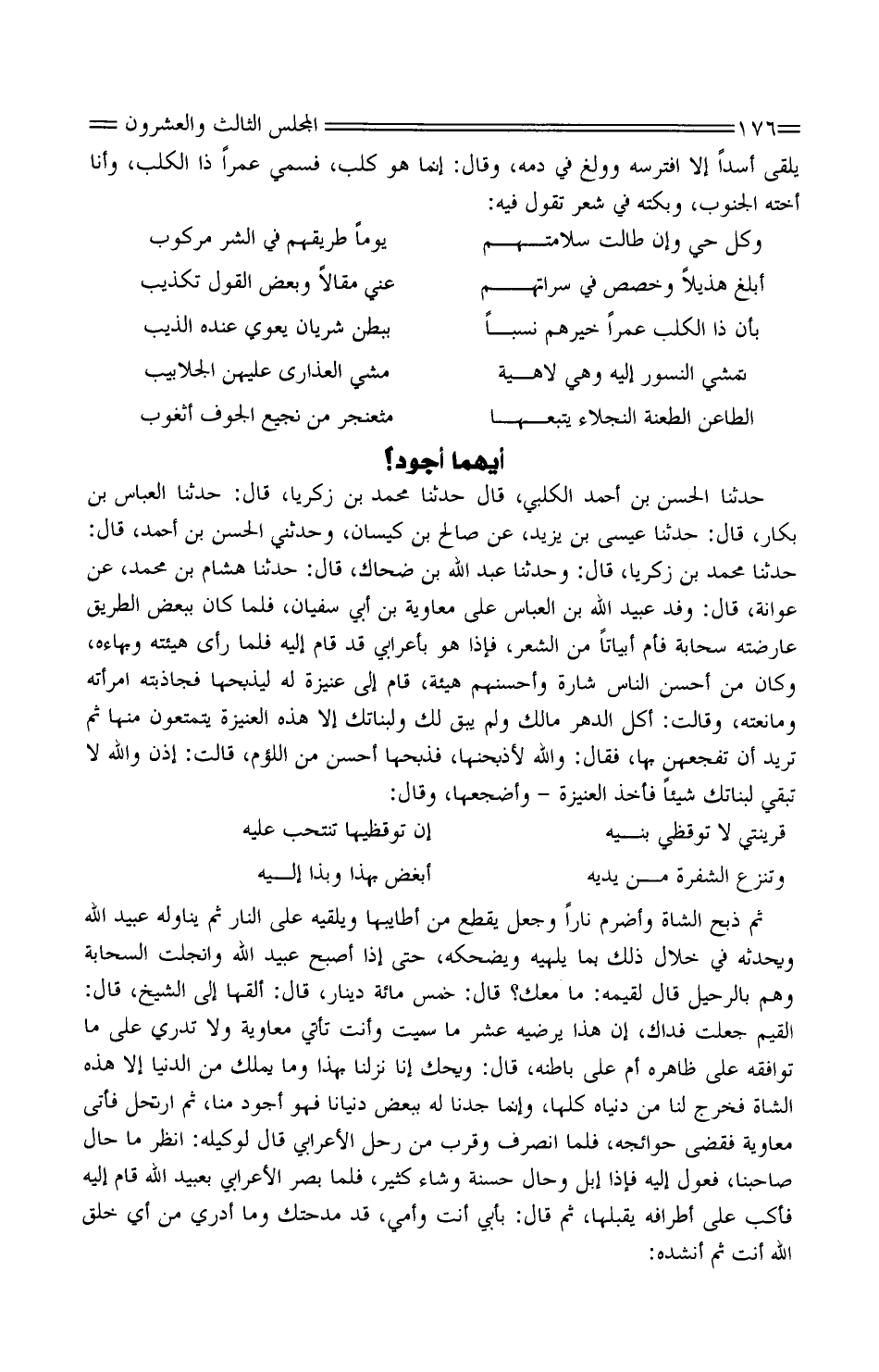 حَدَّثَنَا الْحَسَن بْن أَحْمَد الْكَلْبِيّ، قَالَ حَدَّثَنَا مُحَمَّد بْن زَكَرِيّا، قَالَ: حَدَّثَنَا الْعَبَّاس بْن بكار، قَالَ: حَدَّثَنَا عِيسَى بْن يزِيد، عَنْ صَالح بْن كيسَان، وحَدثني الْحَسَن بْن أَحْمَد، قَالَ: حَدَّثَنَا مُحَمَّد بْن زَكَرِيّا، قَالَ: وَحَدَّثَنَا عَبْد اللَّه بْن ضحاك، قَالَ: حَدَّثَنَا هِشَام بْن مُحَمَّد، عَنْ عوَانَة، قَالَ: وَفد عُبَيْد اللَّه بْن الْعَبَّاس عَلَى مُعَاوِيَة بْن أبي سُفْيَان، فَلَمّا كَانَ بِبَعْض الطَّرِيق عارضته سَحَابَة فأمَّ أبياتًا من الشِّعرَ، فَإِذا هُوَ بأعرابي قَدْ قَامَ إِلَيْهِ فَلَمّا رَأَى هَيئته وبهاءه، وَكَانَ من أحسن النَّاس شارة وَأَحْسَنهمْ هَيْئَة، قَامَ إِلَى عُنَيْزة لَهُ ليذبحها فجاذبته امْرَأَته ومانعته، وَقَالَت: أكَلَ الدهرُ مَالَك وَلم يُبْق لَك ولبناتك إِلَّا هَذِهِ الْعُنَيْزة يتمتعون مِنْهَا ثُمَّ تُرِيدُ أَن تَفْجَعَهُنّ بهَا، فَقَالَ: وَالله لأذبحنّها، فذبْحُها أحسن من اللُّؤم، قَالَت: إِذن وَالله لَا تبقي لبناتك شَيئًا فَأخذ الْعُنَيْزة - وأضجعها، وَقَالَ: