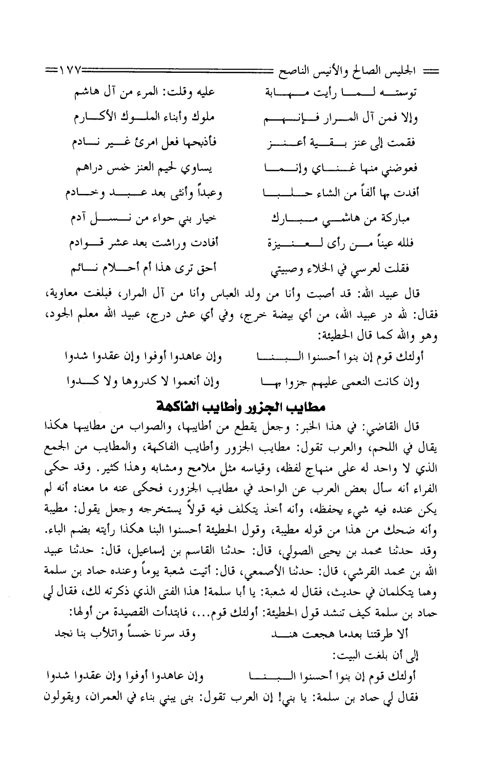 قَالَ القَاضِي: فِي هَذَا الْخَبَر: وَجعل يقطع من أطايبها، وَالصَّوَاب من مطايبها هَكَذَا يُقَالُ فِي اللَّحْم، وَالْعرب تَقول: مطايب الْجَزُور وأطايب الْفَاكِهَة، والمطايب من الْجمع الَّذِي لَا وَاحِد لَهُ عَلَى منهاج لَفظه، وَقِيَاسه مثل ملامح ومشابه وَهَذَا كثير. وَقد حكى الْفراء أَنَّهُ سَأَلَ بَعْض الْعَرَب عَنِ الْوَاحِد فِي مطايب الْجَزُور، فَحكى عَنْهُ مَا مَعْنَاهُ أَنَّهُ لَمْ يكن عِنْدَهُ فِيهِ شَيْءٍ يحفظه، وَأَنه أَخذ يتَكَلَّف فِيهِ قولا يَسْتَخْرِجهُ وَجعل يَقُولُ: مطيبة وَأَنه ضحك من هَذَا من قَوْله مطيبة، وَقَول الحطيئة أَحْسنُوا الْبُنا هَكَذَا رَأَيْته بِضَم الْبَاء. وَقد حَدَّثَنَا مُحَمَّد بْن يحيى الصولي، قَالَ: حَدَّثَنَا القَاسِم بْن إِسْمَاعِيل، قَالَ: حَدَّثَنَا عُبَيْد اللَّه بْن مُحَمَّد الْقُرَشِيّ، قَالَ: حَدَّثَنَا الْأَصْمَعِي، قَالَ: أتيت شُعْبَة يَوْمَا وَعِنْده حَمَّاد بْن سَلَمَة وهما يتكلمان فِي حَدِيث، فَقَالَ لَهُ شُعْبَة: يَا أَبَا سَلَمَة! هَذَا الْفَتى الَّذِي ذكرته لَك، فَقَالَ لي حَمَّاد بْن سَلَمَة كَيْفَ تنشد قَول الحطيئة: أُولَئِكَ قَوْمٍ ... ، فابتدأت القصيدة من أَولهَا: