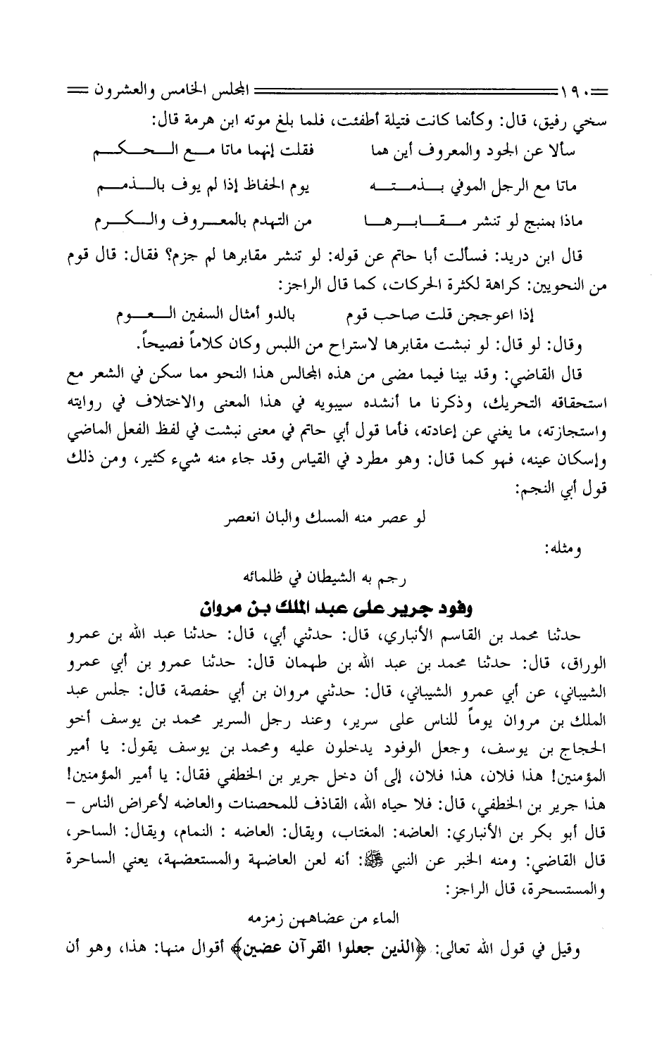 حَدَّثَنَا مُحَمَّد بْن القَاسِم الأنبَاريّ، قَالَ: حَدَّثَنِي أبي، قَالَ: حَدَّثَنَا عَبْد اللَّه بْن عَمْرو الْوراق، قَالَ: حَدَّثَنَا مُحَمَّد بْن عَبْد اللَّه بْن طهْمَان قَالَ: حَدَّثَنَا عَمْرو بْن أبي عَمْرو الشَّيْبَانِيّ، عَنْ أبي عَمْرو الشَّيْبَانيّ، قَالَ: حَدَّثَنِي مَرْوَان بْن أبي حَفْصَة، قَالَ: جلس عَبْد الْملك بْن مَرْوَان يَوْمَا للنَّاس عَلَى سَرِير، وَعند رِجْلِ السرير مُحَمَّد بْن يُوسُف أَخُو الحَجَّاج بْن يُوسُف، وَجعل الْوُفُود يدْخلُونَ عَلَيْهِ وَمُحَمّد بْن يُوسُف يَقُولُ: يَا أَمِير الْمُؤمنِينَ! هَذَا فلَان، هَذَا فلَان، إِلَى أَن دَخَلَ جرير بْن الخَطَفَي فَقَالَ: يَا أَمِير الْمُؤمنِينَ! هَذَا جرير بْن الخطفي، قَالَ: فَلا حَيّاه اللَّه، الْقَاذِف للمُحْصَنَات والعاضِه لأعراض النّاس - قَالَ أَبُو بَكْر بْن الأنبَاريّ: العاضه: الْمُغتاب، وَيُقَال: العاضه: النّمّام، وَيُقَال: السَّاحر، قَالَ القَاضِي: وَمِنْه الْخَبَر عَنِ النَّبيّ صَلَّى اللَّهُ عَلَيْهِ وَسَلَّمَ: أَنَّهُ لعن العاضهة والمستعضهة، يَعْنِي الساحرة والمستسحرة، قَالَ الراجز: