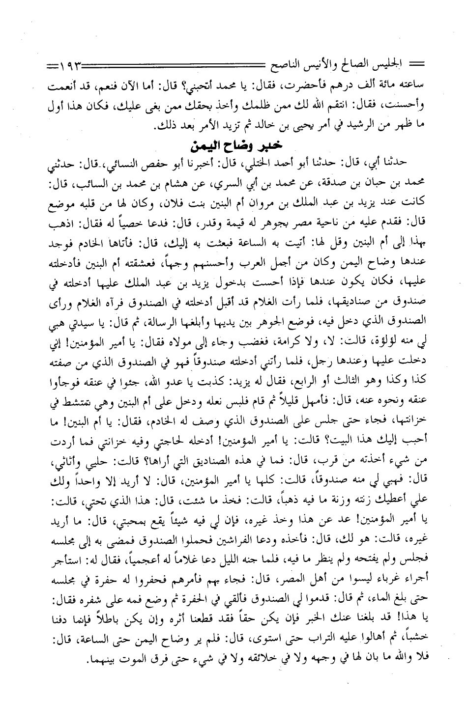 حَدَّثَنَا أبي، قَالَ: حَدَّثَنَا أَبُو أَحْمَد الْخُتلِي، قَالَ: أَخْبَرَنَا أَبُو حَفْص النَّسَائيّ، قَالَ: حَدَّثَنِي مُحَمَّد بْن حِبّان بْن صَدَقة، عَنْ مُحَمَّد بْن أبي السّري، عَنْ هِشَام بْن مُحَمَّد بْن السَّائِب، قَالَ: كَانَتْ عِنْدَ يزِيد بْن عَبْد الْملك بْن مَرْوَان أم الْبَنِينَ بِنْت فلَان، وَكَانَ لَهَا من قلبه مَوضِع قَالَ: فَقدم عَلَيْهِ من نَاحيَة مصر بجوهر لَهُ قيمَة وَقدر، قَالَ: فَدَعَا خصِيًّا لَهُ فَقَالَ: اذْهَبْ بِهَذَا إِلَى أم الْبَنِينَ وَقل لَهَا: أُتيتُ بِهِ الساعةَ فبعثتُ بِهِ إِلَيْكَ، قَالَ: فَأَتَاهَا الْخَادِم فَوجدَ عِنْدهَا وَضَّاحَ الْيمن وَكَانَ من أجمل الْعَرَب وأحسنها وَجها، فعشقته أم الْبَنِينَ فأدخلته عَلَيْهَا، فَكَانَ يكون عِنْدهَا فَإِذا أحسّت بِدُخُول يزِيد بْن عَبْد الْملك عَلَيْهَا أدخلته فِي صندوق من صناديقها، فَلَمّا رَأَتْ الْغُلَام قَدْ أقبل أدخلته فِي الصندوق فَرَآهُ الْغُلَام وَرَأى الصندوق الَّذِي دخل فِيهِ، فَوضع الْجَوْهَر بَيْنَ يَديهَا وأبلغها الرسَالَة، ثُمَّ قَالَ: يَا سيِّدتي هَبِي لي مِنْهُ لُؤْلؤة، قَالَتْ: لَا، وَلَا كَرَامَة، فَغَضب وَجَاء إِلَى مَوْلَاهُ فَقَالَ: يَا أَمِير الْمُؤمنِينَ! إِنِّي دخلت عَلَيْهَا وَعِنْدهَا رَجُل، فَلَمّا رأتني أدخلته صندوقًا فَهُوَ فِي الصندوق الَّذِي من صفته كَذَا وَكَذَا وَهُوَ الثَّالِث أَو الرَّابِع، فَقَالَ لَهُ يزِيد: كذبت يَا عَدو اللَّه، جئوا فِي عُنُقه فوجأوا عُنُقه وَنَحْوه عَنهُ، قَالَ: فأمهل قَلِيلا ثُمَّ قَامَ فَلبس نَعله وَدخل عَلَى أم الْبَنِينَ وَهِي تمتشط فِي خزانتها، فجَاء حَتَّى جلس عَلَى الصندوق الَّذِي وصف لَهُ الْخَادِم، فَقَالَ: يَا أم الْبَنِينَ! مَا أحبب إِلَيْكَ هَذَا الْبَيْت؟ قَالَتْ: يَا أَمِير الْمُؤمنِينَ! أدخلهُ لحاجتي وَفِيه خزانتي فَمَا أردْت من شَيْءٍ أَخَذته من قُرب، قَالَ: فَمَا فِي هَذِهِ الصناديق الَّتِي أَرَاهَا؟ قَالَتْ: حُلِيِّي وأثَاثي، قَالَ: فهبي لي مِنْهُ صندوقًا، قَالَتْ: كلهَا يَا أَمِير الْمُؤمنِينَ، قَالَ: لَا أُرِيد إِلَّا وَاحِدًا وَلَك عليّ أُعْطِيك زِنَته وزنة مَا فِيهِ ذَهبًا، قَالَتْ: فَخذ مَا شِئْت، قَالَ: هَذَا الَّذِي تحتي، قَالَتْ: يَا أَمِير الْمُؤمنِينَ! عَدِّ عَنْ هَذَا وَخذ غَيره، فَإِن لي فِيهِ شَيئًا يَقع بمحبتي، قَالَ: مَا أُرِيد غَيره، قَالَتْ: هُوَ لَك، قَالَ: فَأَخذه ودعا الفراشين فحملوا الصندوق فَمضى بِهِ إِلَى مَجْلِسه فَجَلَسَ وَلم يَفْتَحهُ وَلم ينظر مَا فِيهِ، فَلَمَّا جنه اللَّيْل دَعَا غُلَاما لَهُ أعجميا، فَقَالَ لَهُ: اسْتَأْجر أجراء غرباء لَيْسُوا من أهل الْمصر، قَالَ: فجَاء بهم فَأَمرهمْ فَحَفروا لَهُ حُفْرة فِي مَجْلِسه حَتَّى بلغ المَاء، ثُمَّ قَالَ: قَدِّموا لي الصندوق فألقي فِي الحفرة ثُمَّ وضع فَمه عَلَى شَفْرِهْ فَقَالَ: يَا هَذَا! قَدْ بلغنَا عَنْكَ الْخَبَر فَإِن يكن حَقًا فقد قَطعنَا أَثَره وَإِن يكن بَاطِلا فَإِنَّمَا دفنّا خَشَبًا، ثُمَّ أهالوا عَلَيْهِ التُّرَاب حَتَّى اسْتَوَى، قَالَ: فَلم ير وضاح الْيمن حَتَّى السَّاعَة، قَالَ: فَلا وَالله مَا بَان لَهَا فِي وَجهه وَلَا فِي خلائقه وَلَا فِي شَيْءٍ حَتَّى فرق الْمَوْت بَيْنَهُمَا.