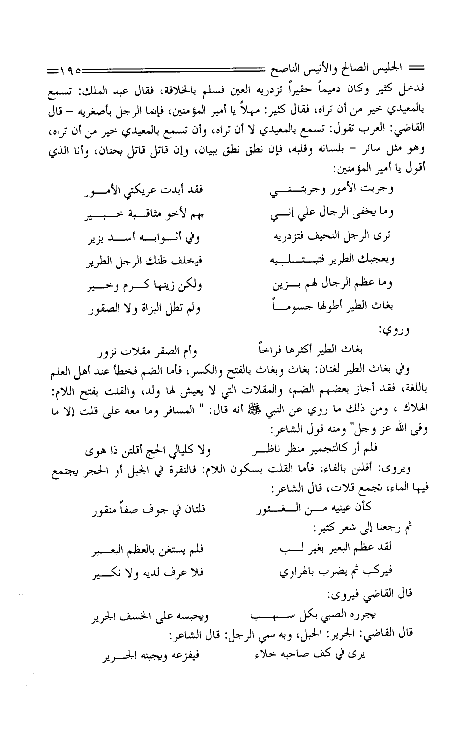 فَدخل كُثير وَكَانَ دميمًا حَقِيرًا تَزْدَريه الْعين فسلّم بالخلافة، فَقَالَ عَبْد الْملك: تَسْمَع بالْمُعَيْديِّ خيرٌ من أَن ترَاهُ، فَقَالَ كثير: مهلا يَا أَمِير الْمُؤمنِينَ، فَإِنَّمَا الرَّجُل بأصغريه - قَالَ القَاضِي: الْعَرَب تَقول: تسمع بالمعيديِّ لَا أَن ترَاهُ، وَأَن تسمع بالمعيدي خَير من أَن ترَاهُ، وَهُوَ مَثَلٌ سَائِر - بِلِسَانِهِ وَقَلبه، فَإِن نَطَق نَطَقَ بِبَيَان، وَإِن قَاتل قَاتل بحنان، وَأَنا الَّذِي أَقُول يَا أَمِير الْمُؤمنِينَ: