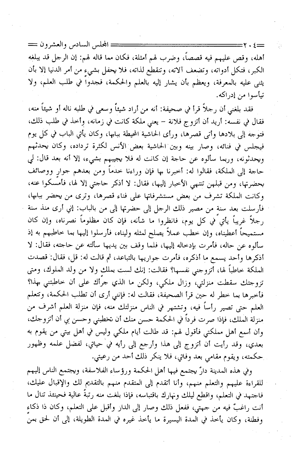 فقد بَلغنِي أَن رَجُلا قَرَأَ فِي صحيفَة: أَنَّهُ من أَرَادَ شَيْئا وسعى فِي طلبه ناله أَوْ شَيْئا مِنْهُ، فَقَالَ فِي نَفسه: أريدُ أَتزوّج فُلانة - يَعْنِي مَلِكَةً كَانَتْ فِي زَمَانه، وَأخذ فِي طلب ذَلِكَ، فتوجَّه إِلَى بلادها وأتى قصرهَا، وَرَأى الْحَاشِيَة المحيطة ببابها، وَكَانَ يَأْتِي الْبَاب فِي كُلّ يوْم فيجلسُ فِي فنائه، وَصَارَ بَينه وبَيْنَ الْحَاشِيَة بعضُ الأنْسِ لِكَثْرَة ترداده، وَكَانَ يُحَدِّثهُمْ ويحدثونه، وَرُبمَا سَأَلُوهُ عَنْ حَاجَة إِن كَانَتْ لَهُ فَلَا يُجِيبهُمْ بِشَيْء، إِلا أَنَّهُ بَعْدُ قَالَ: لي حاجةٌ إِلَى الملكة، فَقَالُوا لَهُ: أخْبِرنا بهَا فإنّ وَرَاءَنَا خدمًا وَمن بعدهمْ جوارٍ ووصائفَ بحضرتها، وَمن قِبَلِهِنَّ تَنْتَهِي الْأَخْبَار إِلَيْهَا، فَقَالَ: لَا أذكر حَاجَتي إِلا لَهَا، فأمسكوا عَنْهُ، وَكَانَت الملكةُ تشرِفُ من بعض مُسْتشرفاتها عَلَى فنَاء قصرهَا، وَترى من يَحْضُرُ ببابها، فأرسلتْ بعد سنةٍ من مصير ذَلِكَ الرَّجُل إِلَى حضرتها إِلَى مَنْ بِالْبَابِ: إِنِّي أرى منذُ سَنة رجلا غَرِيبا يَأْتِي فِي كُلّ يوْم، فانظروا مَا شَأْنه، فَإِن كَانَ مَظْلُوما نصرناهُ، وَإِن كَانَ مُسْتميحًا أعطيناه، وَإِن خطب عملا يصلُحُ لمثله ولّيناه، فأرسلوا إِلَيْهَا بِمَا خاطبهم بِهِ إِذْ سَأَلُوهُ عَنْ حَاله، فَأمرت بإدخاله إِلَيْهَا، فَلَمَّا وقف بَيْنَ يَديهَا سَأَلْتُهُ عَنْ حَاجته، فَقَالَ: لَا أذكرها وأحدٌ يسمعُ مَا أذكرهُ، فَأمرت جواريها بالتباعد، ثُمّ قالَتْ لَهُ: قُل، فَقَالَ: قصدتُ الملكة خاطبًا لَهَا، أتزوِّجُني نَفسهَا؟ فَقَالَت: إِنَّك لست بملكٍ وَلَا من وَلَد الْمُلُوك، وَمَتى تزوجتُك سقطَت منزلتي، وَزَالَ ملكي، وَلَكِن مالذي جَرَّأك عَلَى أَن خاطبتني بِهَذَا؟ فَأَخْبرهَا بِمَا خطر لَهُ حِين قَرَأَ الصَّحِيفَة، فَقَالَت لَهُ: فإنني أرى أَن تطلب الْحِكْمَة، وتتعلم الْعلم حَتَّى تصير رَأْسا فِيهِ، وتشتهر فِي النّاس منزلتك مِنْهُ، فَإِن منزلَة الْعلم أشرفُ من منزلَة الْمُلْك، فَإِذا صرتَ فَردا فِي الْحِكْمَة حَسُن مِنْك أَن تَخْطُبنِي وحَسُن بِي أَن أتزوَّجك، وَأَن أسمع أَهل مملكتي فَأَقُول لَهُم: قَدْ طالَتْ أيّامُ مُلكي وَلَيْسَ فِي أَهْل بَيْتِي من يقوم بِهِ بعدِي، وَقَدْ رَأَيْت أَن أَتزوّج إِلَى هَذَا وأرجع إِلَى رَأْيه فِي حَياتِي، لفضل علمه وَظُهُور حكمته، وَيقوم مقَامي بعد وفاتي، فَلَا ينكرُ ذَلِكَ أحدٌ من رعيتي.