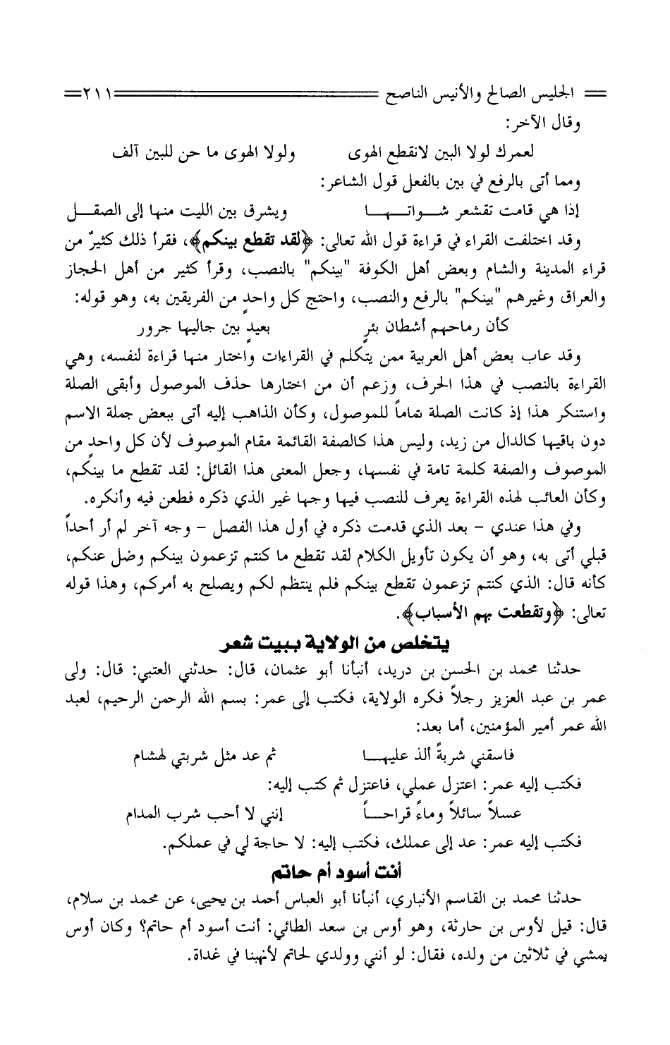 وَقَدْ عَابَ بعضُ أَهْل الْعَرَبيَّة مِمَّنْ يتكلّم فِي الْقرَاءَات واخْتَار مِنْهَا قِرَاءَة لنَفسِهِ، وَهِي الْقِرَاءَة بِالنّصب فِي هَذَا الْحَرْف، وَزعم أَن من اخْتَارَهَا حَذَف الْمَوْصُول وَأبقى الصِّلَة واسْتُنْكِرَ هَذَا إِذْ كَانَت الصِّلَة تَمامًا للموصول، وَكَأن الذَّاهب إِلَيْهِ أَتَى بِبَعْض جملَة الِاسْم دون بَاقِيهَا كالدَّال من زَيْد، وَلَيْسَ هَذَا كالصفة الْقَائِمَة مقَام الْمَوْصُوف لِأَن كُلّ واحدٍ من الْمَوْصُوف وَالصّفة كلمة تَامَّة فِي نَفسهَا، وَجَعَل الْمَعْنى هَذَا الْقَائِل: لقَدْ تقطع مَا بَيْنكُم، وَكَأن العائب لهَذِهِ الْقِرَاءَة يعرف للنصب فِيهَا وَجها غَيْر الَّذِي ذكره فطعن فِيهِ وَأنْكرهُ.