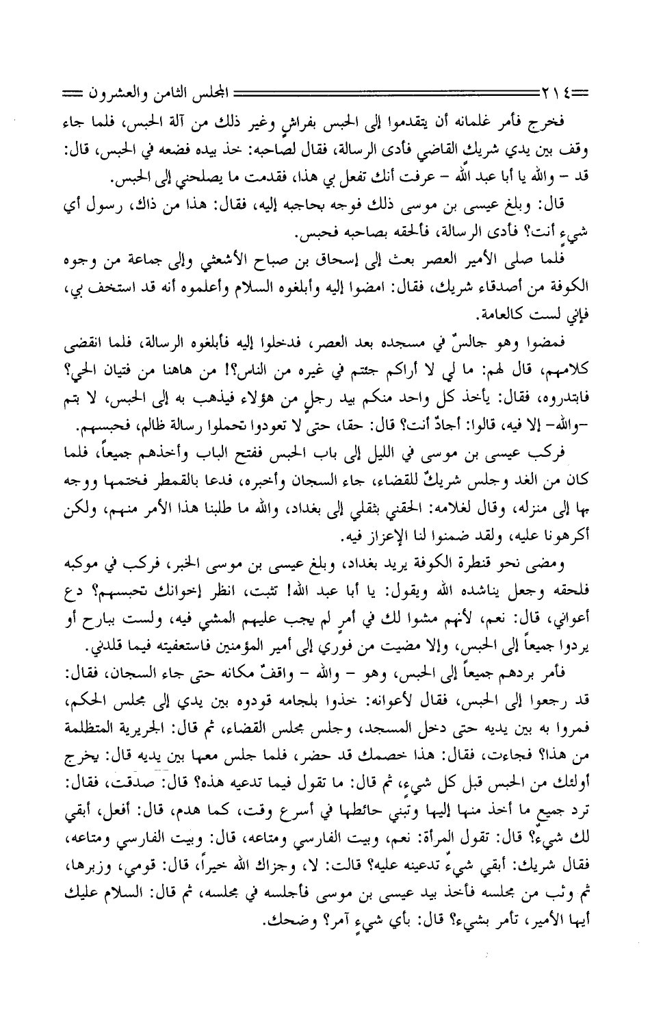 فَأمر بردهمْ جَمِيعًا إِلَى الْحَبْس، وَهُوَ - واللَّه - واقفٌ مَكَانَهُ حَتَّى جَاءَ السَّجَّان، فَقَالَ: قَدْ رجعُوا إِلَى الْحَبْس، فَقَالَ لأعوانه: خُذُوا بلجامه قُودُوه بَيْنَ يَدَيَّ إِلَى مجْلِس الْحُكْم، فَمَرُّوا بِهِ بَيْنَ يَدَيْهِ حَتَّى دخل الْمَسْجِد، وَجلسَ مجْلِس الْقَضَاء، ثُمّ قَالَ: الجَرِيرِيَّةُ الْمُتَظَلِّمةُ من هَذَا؟ فَجَاءَت، فَقَالَ: هَذَا خَصْمُكِ قَدْ حضر، فَلَمَّا جلس مَعهَا بَيْنَ يَدَيْهِ قَالَ: يَخْرجُ أُولَئِكَ من الْحَبْس قبل كُلّ شيءٍ، ثُمّ قَالَ: مَا تقولُ فِيمَا تَدَّعِيه هَذِهِ؟ قَالَ: صَدَقَتْ، فَقَالَ: تَرُدُّ جميعَ مَا أُخِذَ مِنْهَا إِلَيْهَا وتَبْنِي حائطَها فِي أسْرع وَقت، كَمَا هدم، قَالَ: أَفْعَلُ، أَبقِيَ لَكِ شيءٌ؟ قَالَ: تَقُولُ المرأةُ: نعم، وبيتُ الفارسيّ ومَتاعُه، قَالَ: وبيتُ الفارسيّ ومتاعُه، فَقَالَ شريك: أبَقِيَ شيءٌ تَدّعينه عَلَيْه؟ قَالَتْ: لَا، وجَزَاكَ اللَّهُ خيرا، قَالَ: قُومي، وَزَبرها، ثُمّ وثب من مَجْلِسه فَأخذ بيد عِيسَى بْن مُوسَى فأجْلَسَه فِي مَجْلِسِه، ثُمّ قَالَ: السَّلام عَلَيْك أَيهَا الْأَمِير، تأمرُ بِشَيْء؟ قَالَ: بأيِّ شيءٍ آمُر؟ وَضحك.