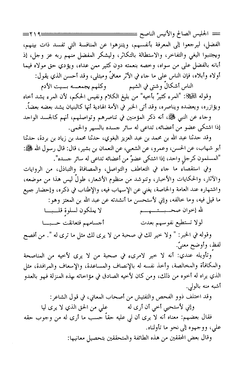 وَفِي استقصاء مَا جَاءَ فِي التعاطف والتواصل، والمصافاة والتباذل، من الرِّوَايَات والْآثَار، والحكايات وَالْأَخْبَار، وتُنُوشد من منظوم الأَشْعَار، طولٌ لَيْسَ هَذَا من مَوْضِعه، واشتهارهُ عِنْد الْعَامَّة والخاصة، يُغني عَنِ الإسهاب فِيهِ، والإطناب فِي ذكره، وإحضار جُمَيْع مَا قِيلَ فِيهِ، وَمَا خَالفه، وَإِنِّي لأستحسنُ مَا أنشدتُه عَنْ عَبْد اللَّه بْن الْمُعْتَزّ وَهُوَ: