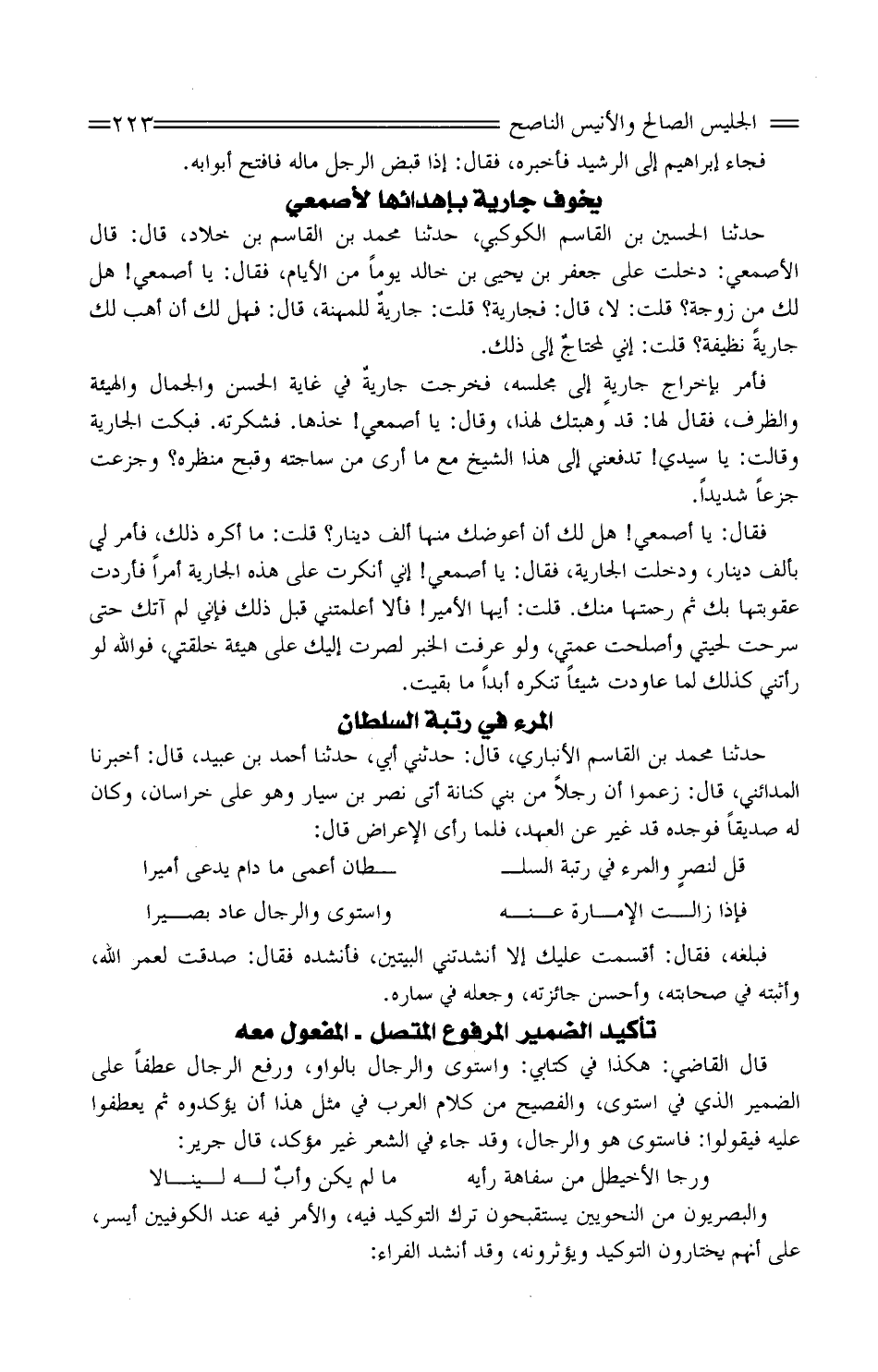 حَدَّثَنَا الْحُسَيْنُ بْنُ الْقَاسِمِ الْكَوْكَبِيُّ، حَدَّثَنَا مُحَمَّد بْن القَاسِم بْن خَلاد، قَالَ: قَالَ الْأَصْمَعِي: دخلت عَلَى جَعْفَر بْن يَحْيَى بْن خَالِد يَوْمًا من الأيَّام، فَقَالَ: يَا أصْمَعيُّ! هَلْ لَك من زَوْجَة؟ قُلْتُ: لَا، قَالَ: فجارية؟ قُلْتُ: جاريةٌ للمِهْنة، قَالَ: فَهَل لَك أَن أهبَ لَك جَارِيَة نظيفة؟ قُلْتُ: إِنِّي لمحتاجٌ إِلَى ذَلِكَ.
