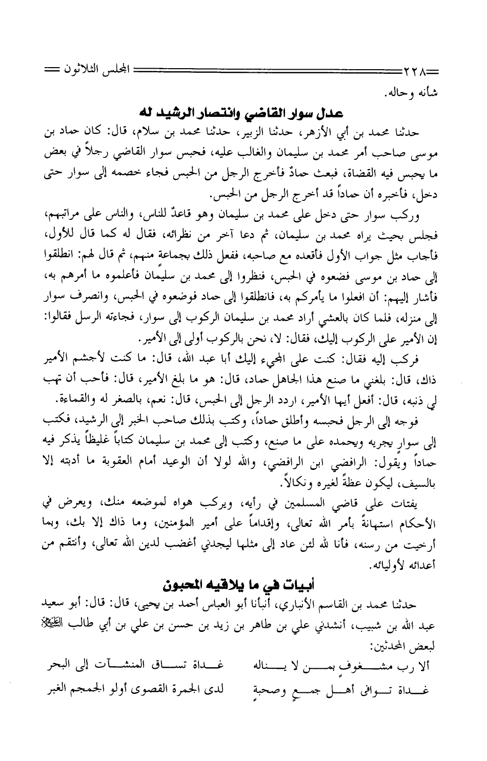 حَدَّثَنَا مُحَمَّد بْن الْقَاسِم الْأَنْبَارِي، أَنْبَأَنَا أَبُو الْعَبَّاس أَحْمَد بْن يَحْيَى، قَالَ: قَالَ: أَبُو سَعِيد عَبْد اللَّه بْن شبيب، أَنْشدني عَلِيّ بْن طَاهِر ابْن زَيْد بْن حسن بْن عَلِيّ بْن أبي طَالِب عَلَيْهِ السّلام لبَعض الْمُحدثين: