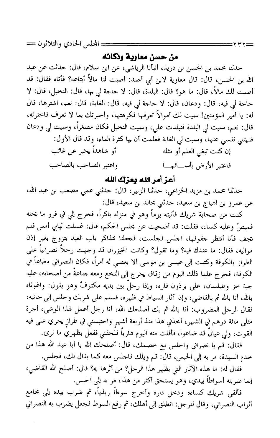 حَدَّثَنَا مُحَمَّدُ بْنُ الْحَسَنِ بْنِ دُرَيْدٍ، أَنْبَأَنَا الرِّيَاشِيُّ، عَنِ ابْنِ سَلامٍ، قَالَ: حُدِّثْتُ عَنْ عَبْدِ اللَّهِ بْنِ الْحَسَنِ، قَالَ: قَالَ مُعَاوِيَةُ لابْنِ أَبِي أَحْمَدَ: أَصَبْتَ لَنَا مَالا أَبْتَاعُهُ؟ فَأَتَاهُ فَقَالَ: قَدْ أَصَبْتُ لَكَ مَالا، قَالَ: مَا هُوَ؟ قَالَ: البَلْدَةُ، قَالَ: لَا حَاجَةَ لِي بِهَا، قَالَ: النُّخَيْلُ، قَالَ: لَا حَاجَةَ لِي فِيهِ، قَالَ: وَدْعَانُ، قَالَ: لَا حَاجَةَ لِي فِيهِ، قَالَ: الْغَابَةُ، قَالَ: نَعَمْ، اشْتَرِهَا، قَالَ لَهُ: يَا أَمِيرَ الْمُؤْمِنِينَ! سَمَّيْتُ لَكَ أَمْوَالا تَعْرِفُهَا فَكَرِهْتَهَا، وَأَخْبَرْتُكَ بِمَا لَا تَعْرِفُ فَاخْتَرْتَهُ، قَالَ: نَعَمْ، سَمَّيْتَ لِيَ الْبَلْدَةَ فَتَبَلَّدَتْ عَلَّيَ، وَسَمَّيْتَ النُّخَيْلَ فَكَانَ مُصَغَّرًا، وَسَمَّيْتَ لِي وَدْعَانَ فَنَهَتْنِي نَفْسِي عَنْهَا، وَسَمَّيْتَ لِيَ الْغَابَةَ فَعَلِمْتُ أَنَّ بِهَا كَثْرَةَ الْمَاءِ، وَقَدْ قَالَ الأَوَّلُ: