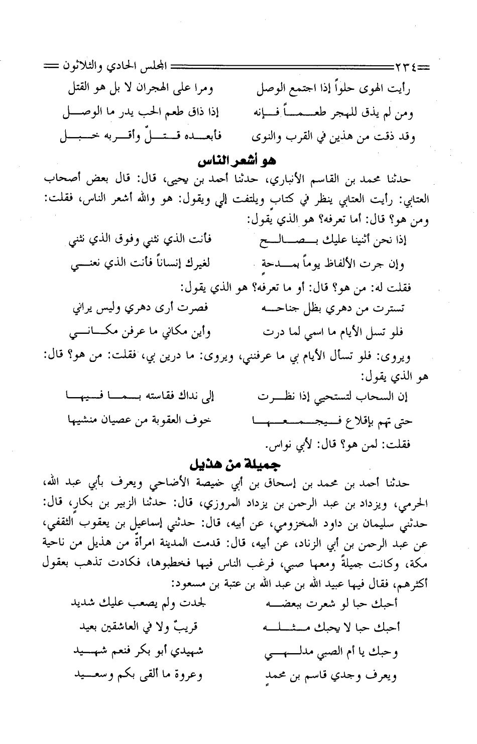 حَدَّثَنَا مُحَمَّد بْن القَاسِم الأنبَاريّ، حَدَّثَنَا أَحْمَد بْن يَحْيَى، قَالَ: قَالَ بعض أَصْحَاب العتابي: رَأَيْت العَتَّابِيّ ينظر فِي كتابٍ ويلتفتُ إليَّ وَيَقُولُ: هُوَ واللَّهِ أشعرُ النّاس، فَقلت: وَمن هُوَ؟ قَالَ: أما تعرفُه؟ هُوَ الَّذِي يَقُولُ: