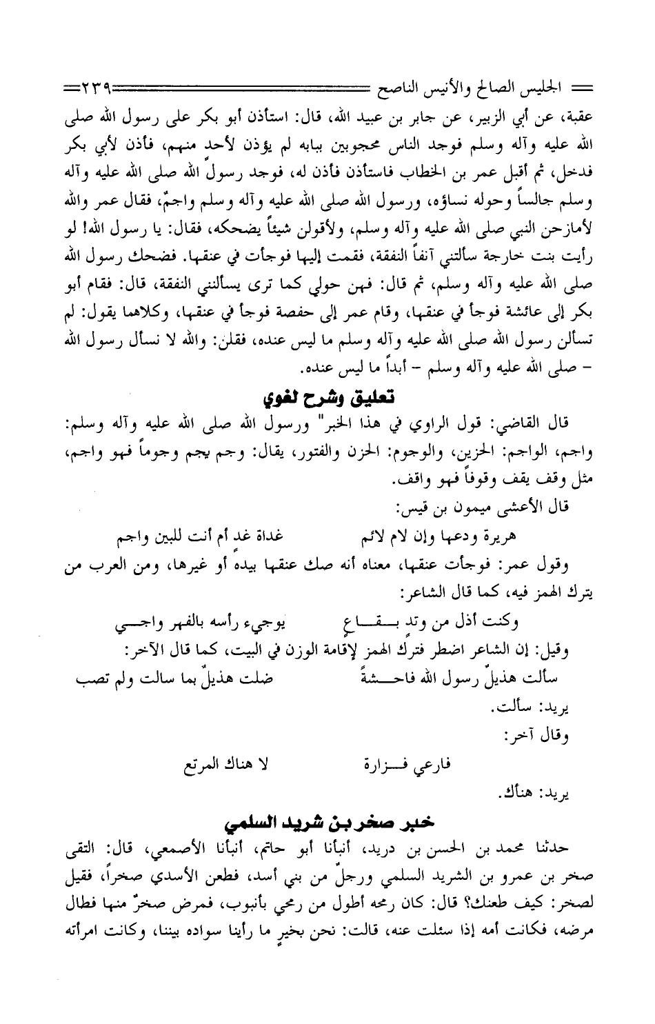 عُقْبَةَ، عَنْ أَبِي الزُّبَيْرِ، عَنْ جَابِرِ بْنِ عُبَيْدِ اللَّهِ، قَالَ: اسْتَأْذَنَ أَبُو بَكْرٍ عَلَى رَسُولِ اللَّهِ صَلَّى اللَّهُ عَلَيْهِ وَآلِهِ وَسَلَّمَ فَوَجَدَ النَّاسَ مَحْجُوبِينَ بِبَابِهِ لَمْ يُؤْذَنْ لأحدٍ مِنْهُمْ، فَأَذِنَ لأَبِي بَكْرٍ فَدَخَلَ، ثُمَّ أَقْبَلَ عُمَرُ بْنُ الْخَطَّابِ فَاسْتَأْذَنَ فَأُذِنَ لَهُ، فَوَجَدَ رَسُولَ اللَّهِ صَلَّى اللَّهُ عَلَيْهِ وَآلِهِ وَسَلَّمَ جَالِسًا وَحَوْلَهُ نِسَاؤُهُ، وَرَسُولُ اللَّهِ صَلَّى اللَّهُ عَلَيْهِ وَآلِهِ وَسَلَّمَ واجمٌ، فَقَالَ عُمَرُ وَاللَّهِ لأُمَازِحَنَّ النَّبِيَّ صَلَّى اللَّهُ عَلَيْهِ وَآله وَسَلَّمَ، وَلأَقُولَنَّ شَيْئًا يُضْحِكُهُ، فَقَالَ: يَا رَسُولَ اللَّهِ! لَوْ رَأَيْتَ بِنْتَ خَارِجَةَ سَأَلَتْنِي آنِفًا النَّفَقَةَ، فَقُمْتُ إِلَيْهَا فَوَجَأْتُ فِي عُنُقِهَا. فَضَحِكَ رَسُولَ اللَّهِ صَلَّى اللَّهُ عَلَيْهِ وَآلِهِ وَسَلَّمَ، ثُمَّ قَالَ: فَهُنَّ حَوْلِي كَمَا تَرَى يَسْأَلُنَّنِي النَّفَقَةَ، قَالَ: فَقَامَ أَبُو بَكْرٍ إِلَى عَائِشَةَ فَوَجَأَ فِي عُنُقِهَا، وَقَامَ عُمَرُ إِلَى حَفْصَةَ فَوَجَأَ فِي عُنُقِهَا، وَكِلاهُمَا يَقُولُ: لِمَ تَسْأَلْنَ رَسُولَ اللَّهِ صَلَّى اللَّهُ عَلَيْهِ وَآلِهِ وَسَلَّمَ مَا لَيْسَ عِنْدَهُ، فَقُلْنَ: وَاللَّهِ لَا نَسْأَلُ رَسُولَ اللَّهِ - صَلَّى اللَّهُ عَلَيْهِ وَآلِهِ وَسَلَّمَ - أَبَدًا مَا لَيْسَ عِنْدَهُ.