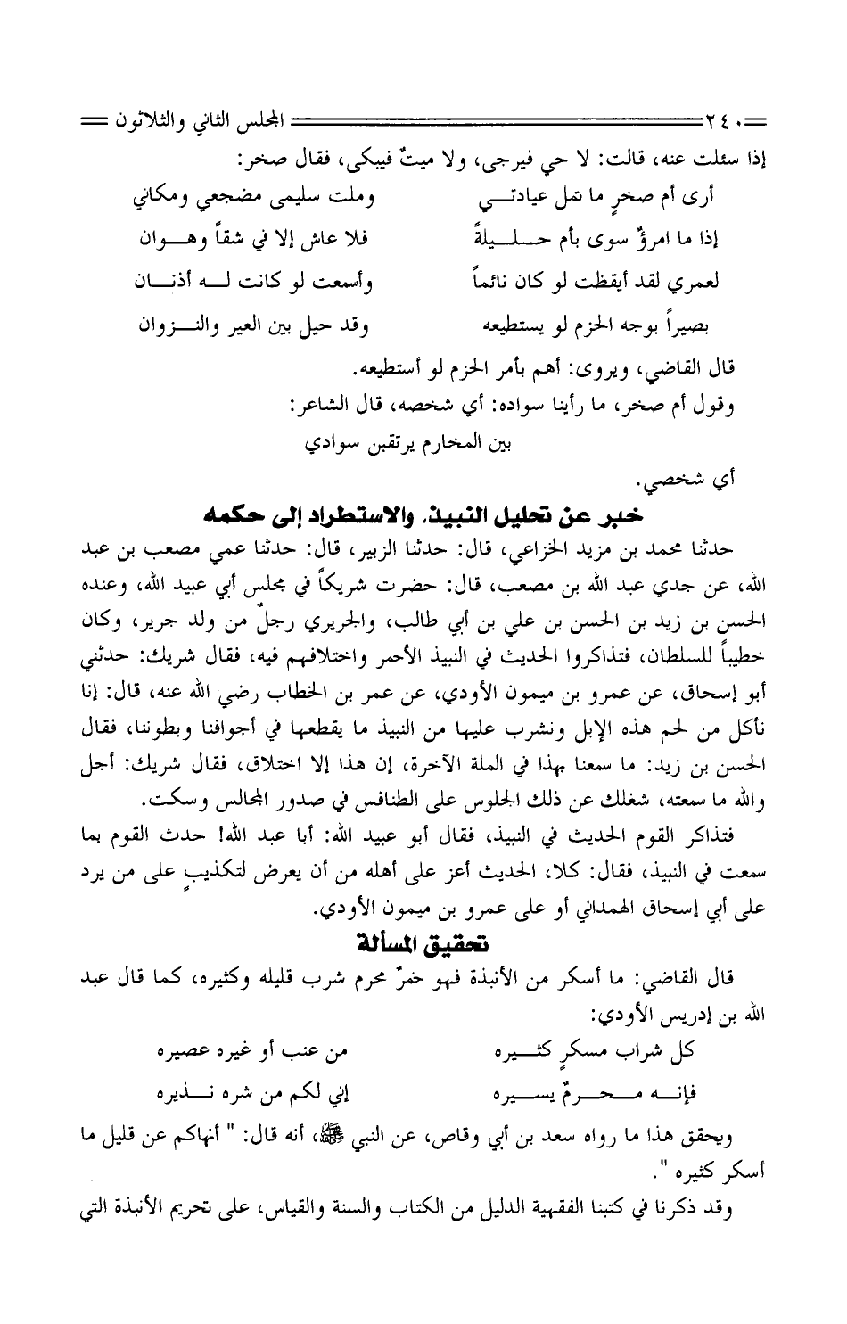 حَدَّثَنَا مُحَمَّدُ بْن مَزْيَد الْخُزَاعِيّ، قَالَ: حَدَّثَنَا الزُّبَيْرُ، قَالَ: حَدَّثَنَا عَمِّي مُصْعَبُ بْنُ عَبْدِ اللَّهِ، عَنْ جَدِّي عَبْدِ اللَّهِ بْنِ مُصْعَبٍ، قَالَ: حَضَرْتُ شَرِيكًا فِي مَجْلِسِ أَبِي عُبَيْدِ اللَّهِ، وَعِنْدَهُ الْحَسَنُ بْنُ زَيْدِ بْنِ الْحَسَنِ بْنِ عَلِيِّ بْنِ أَبِي طَالِبٍ، وَالْجُرَيْرِيُّ رجلٌ مِنْ وَلَدِ جُرَيْرٍ، وَكَانَ خَطِيبًا لِلسُّلْطَانِ، فَتَذَاكَرُوا الْحَدِيثَ فِي النَّبِيذِ الأَحْمَرِ وَاخْتِلافِهِمْ فِيهِ، فَقَالَ شَرِيكٌ: حَدَّثَنِي أَبُو إِسْحَاقَ، عَنْ عَمْرِو بْنِ مَيْمُونٍ الأَوْدِيِّ، عَنْ عُمَرَ بْن الخَطَّاب رَضِيَ اللَّه عَنْهُ، قَالَ: إِنَّا نَأْكُلُ مِنْ لَحْمِ هَذِهِ الإِبِلِ وَنَشْرَبُ عَلَيْهَا مِنَ النَّبِيذِ مَا يَقْطَعُهَا فِي أَجْوَافِنَا وَبُطُونِنَا، فَقَالَ الْحَسَنُ بْنُ زَيْدٍ: مَا سَمِعْنَا بِهَذَا فِي الْمِلَّةِ الآخِرَةِ، إِنْ هَذَا إِلا اخْتِلاقٌ، فَقَالَ شَرِيكٌ: أَجَلْ وَاللَّهِ مَا سَمِعْتُهُ، شَغَلَكَ عَنْ ذَلِكَ الْجُلُوسُ عَلَى الطَّنَافِسِ فِي صُدُورِ الْمَجَالِسِ وَسَكَتَ.