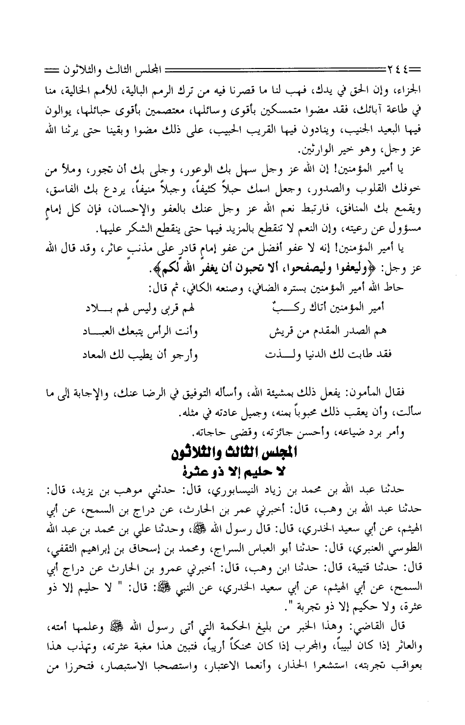 يَا أَمِير الْمُؤْمِنِين! إنَّه لَا عَفْوَ أفضلُ من عَفْو إمامٍ قادرٍ عَلَى مذنبٍ عَاثِر، وَقَدْ قَالَ اللَّه عَزَّ وَجل: " وليعفو وَلْيَصْفَحُوا، أَلا تُحِبُّونَ أَنْ يَغْفِرَ الله لكم ".