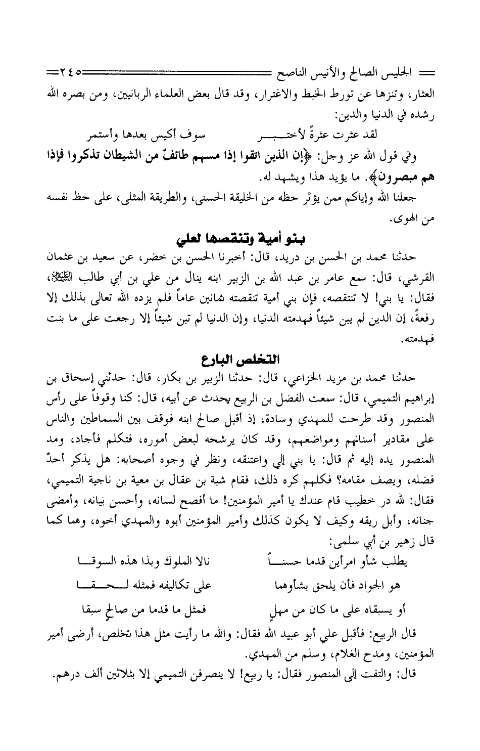 قَالَ الرَّبِيع: فَأَقْبَلَ عَليّ أَبُو عُبَيْد اللَّه فَقَالَ: واللَّه مَا رَأَيْت مثل هَذَا تخلص، أرْضى أَمِير الْمُؤْمِنِين، ومدح الْغُلَام، وَسلم من الْمهْدي.