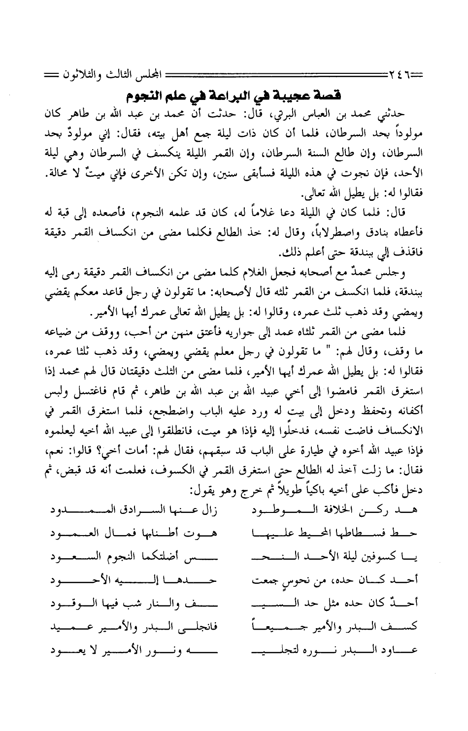 وَجلسَ محمدٌ مَعَ أَصْحَابه فَجعل الْغُلَام كلما مضى من انكساف الْقَمَر دقيقة رمى إِلَيْهِ ببندقة، فَلَمَّا انكسف من الْقَمَر ثُلثه قَالَ لأَصْحَابه: مَا تَقولُونَ فِي رَجُل قَاعد مَعكُمْ يقْضِي ويمضي وَقَدْ ذهب ثلث عمره، وَقَالُوا لَهُ: بل يُطِيل اللَّه تَعَالَى عمرك أَيهَا الْأَمِير.