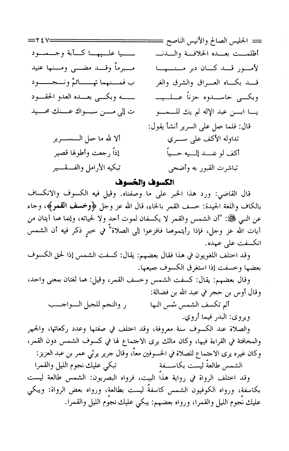 وَالصَّلَاة عِنْد الْكُسُوف سنة مَعْرُوفَة، وَقَد اخْتلف فِي صفتهَا وَعدد ركعاتها، والجهر والمخافتة فِي الْقِرَاءَة فِيهَا، وَكَانَ مَالك يرى الِاجْتِمَاع لَهَا فِي كسوف الشَّمْس دون الْقَمَر، وَكَانَ غَيره يرى الِاجْتِمَاع للصَّلَاة فِي الخسوفين مَعًا، وقَالَ جرير يرثي عُمَر بْن عَبْد الْعَزِيز: