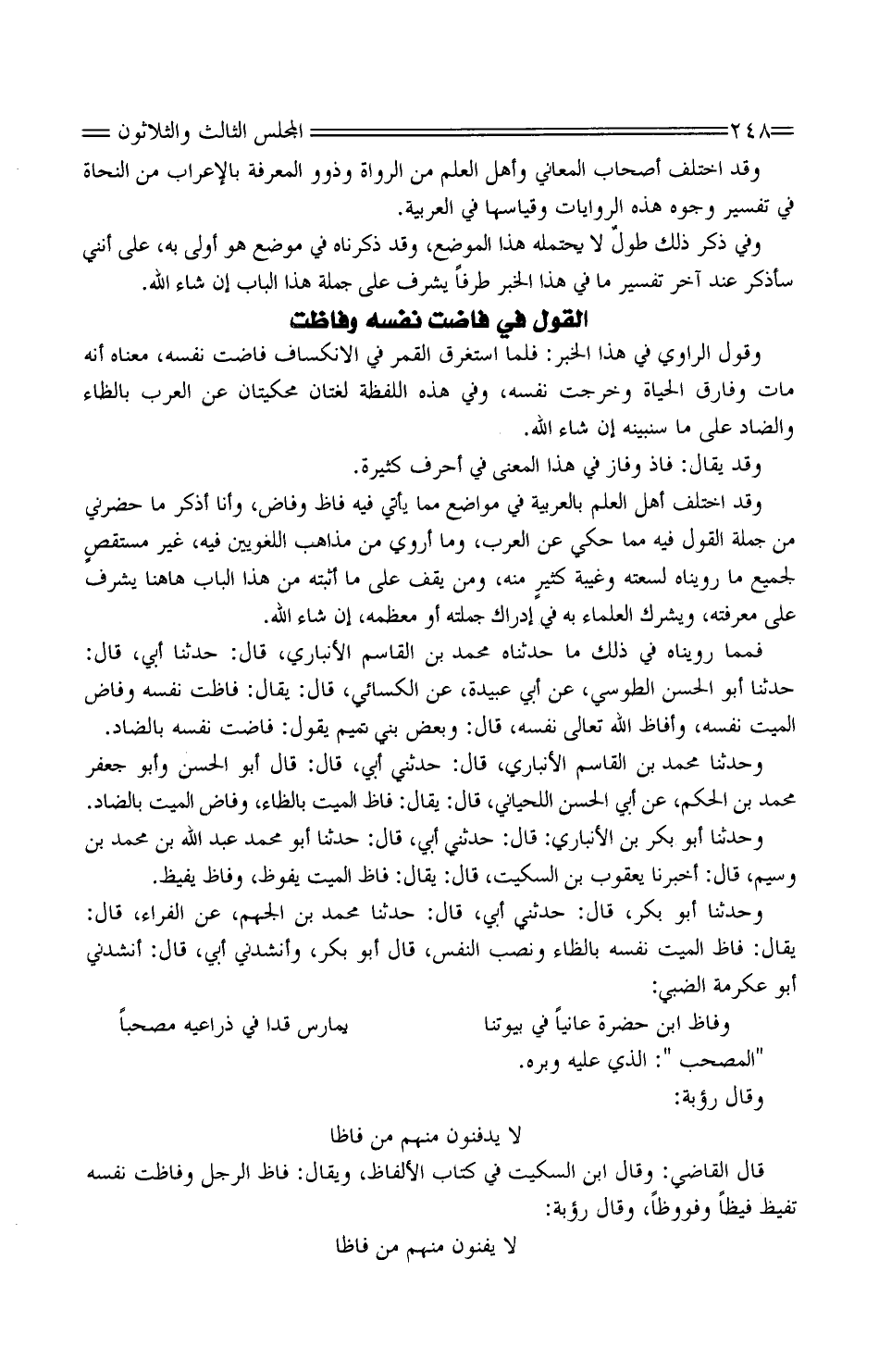 وَقَول الرَّاوِي فِي هَذَا الْخَبَر: فَلَمَّا استغرق الْقَمَر فِي الإنكساف فاضت نَفسه، مَعْنَاهُ أَنَّهُ مَاتَ وَفَارق الْحَيَاة وَخرجت نَفسه، وَفِي هَذِهِ اللَّفْظَة لُغَتان محكيتان عَنِ الْعَرَب بالظاء وَالضَّاد عَلَى مَا سنبينه إِن شَاءَ اللَّه.