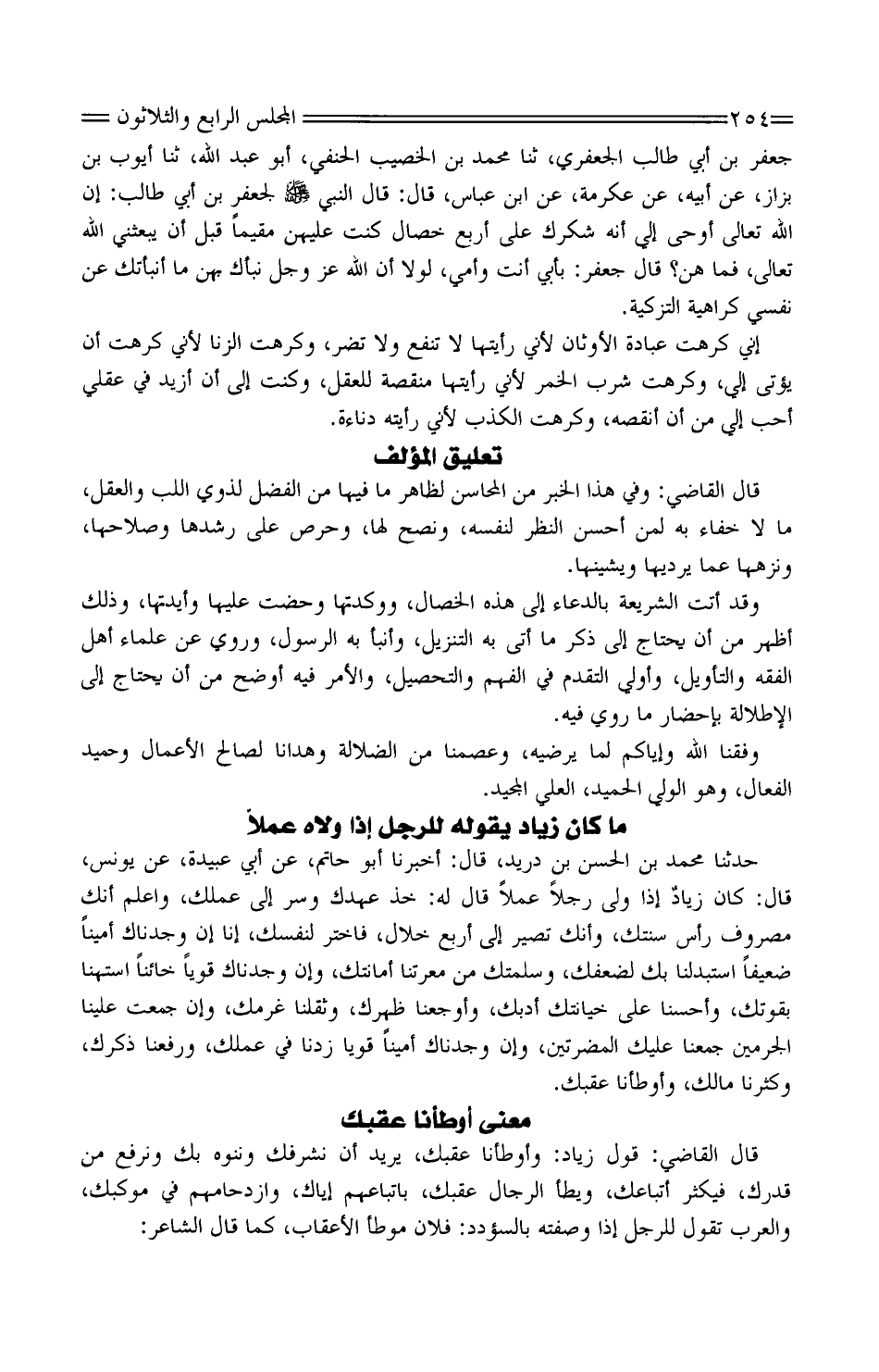 جَعْفَر ابْن أَبِي طَالِبٍ الْجَعْفَرِيُّ، ثَنَا مُحَمَّدُ بْنُ الْخَصِيبِ الْحَنَفِيُّ، أَبُو عَبْدِ اللَّهِ، ثَنَا أَيُّوبُ بْنُ بَزَّازٍ، عَنْ أَبِيهِ، عَنْ عِكْرِمَةَ، عَنِ ابْنِ عَبَّاسٍ، قَالَ: قَالَ النَّبِيُّ صَلَّى اللَّهُ عَلَيْهِ وَسَلَّمَ لِجَعْفَرِ بْنِ أَبِي طَالِبٍ: إِنَّ اللَّهَ تَعَالَى أَوْحَى إِلَيَّ أَنَّهُ شَكَرَكَ عَلَى أَرْبَعِ خِصَالٍ كُنْتَ عَلَيْهِنَّ مُقِيمًا قَبْلَ أَنْ يَبْعَثَنِي اللَّهُ تَعَالَى، فَمَا هُنَّ؟ قَالَ جَعْفَرٌ: بِأَبِي أَنْتَ وَأُمِّي، لَوْلا أَنَّ اللَّهَ عَزَّ وَجَلَّ نَبَّأَكَ بِهِنَّ مَا أَنْبَأْتُكَ عَنْ نَفْسِي كَرَاهِيَةَ التَّزْكِيَةِ.