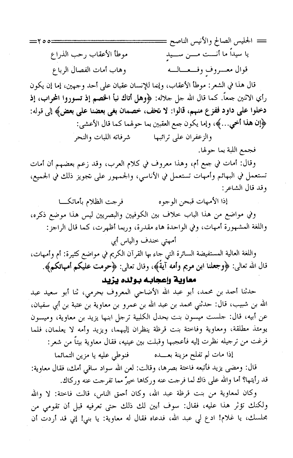 حَدَّثَنَا أَحْمَدُ بْنُ مُحَمَّدٍ، أَبُو عَبْدِ اللَّهِ الأضَاحِيُّ الْمَعْرُوفُ بِحَرَمِيٍّ، ثَنَا أَبُو سَعِيد عَبْد اللَّه بْن شَبِيبٍ، قَالَ: حَدَّثَنِي مُحَمَّدُ بْنُ عبد الله بن عَمْرو ابْن مُعَاوِيَةَ بْنِ عُتْبَةَ بْنِ أَبِي سُفْيَانَ، عَنْ أَبِيهِ، قَالَ: جَلَسَتْ مَيْسُونُ بِنْتُ بَحْدَلٍ الْكَلْبِيَّةُ تُرَجِّلُ ابْنَهَا يَزِيدَ بْنَ مُعَاوِيَةَ، وَمَيْسُونُ يَوْمَئِذٍ مُطَلَّقَةٌ، وَمُعَاوِيَةُ وَفَاخِتَةُ بِنْتُ قَرَظَةَ يَنْظُرَانِ إِلَيْهِمَا، وَيَزِيدُ وَأُمُّهُ لَا يَعْلَمَانِ، فَلَمَّا فَرَغَتْ مِنْ تَرْجِيلِهِ نَظَرَتْ إِلَيْهِ فَأَعْجَبَهَا وَقَبَّلَتْ بَيْنَ عَيْنَيْهِ، فَقَالَ مُعَاوِيَةُ بَيْتًا مِنَ شِعْرٍ: