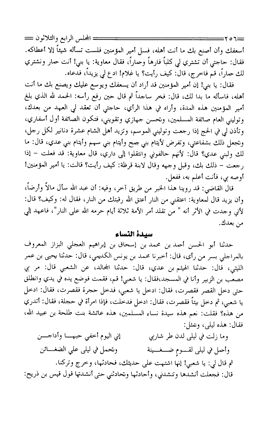حَدَّثَنَا أَبُو الْحَسَن أَحْمَد بْن مُحَمَّدِ بْنِ إِسْحَاقَ بْنِ إِبْرَاهِيمَ الْعِجْلِيُّ الْبَزَّازُ الْمَعْرُوفُ بِالْمَرَاجِلِيِّ بِسُرَّ مَنْ رَأَى، قَالَ: أَخْبَرَنَا مُحَمَّدُ بْنُ يُونُسَ الْكُدَيْمِيُّ، قَالَ: حَدَّثَنَا يَحْيَى بْنُ عُمَرَ اللَّيْثِيُّ، قَالَ: حَدَّثَنَا الْهَيْثَمُ بْنُ عَدِيٍّ، قَالَ: حَدَّثَنَا الْمُجَالِدُ، عَنِ الشَّعْبِيِّ قَالَ: مَرَّ بِي مُصْعَبُ بْنُ الزُّبَيْرِ وَأَنَا فِي الْمَسْجِدِ، فَقَالَ: يَا شَعْبِيُّ! قُمْ، فَقُمْتُ فَوَضَعَ يَدَهُ فِي يَدِي وَانْطَلَقَ حَتَّى دَخَلَ الْقَصْرَ فَقَصَّرْتُ، فَقَالَ: ادْخُلْ يَا شَعْبِيُّ، فَدَخَلَ حُجْرَةً فَقَصَّرْتُ، فَقَالَ: ادْخُلْ يَا شَعْبِيُّ، ثُمَّ دَخَلَ بَيْتًا فَقَصَّرْتُ، فَقَالَ: ادْخُلْ فَدَخَلْتُ، فَإِذَا امْرَأَةٌ فِي حَجَلَةٍ، فَقَالَ: أَتَدْرِي مَنْ هَذِهِ؟ فَقُلْتُ: نَعَمْ هَذِهِ سَيِّدَةُ نِسَاءِ الْمُسْلِمِينَ، هَذِهِ عَائِشَةُ بِنْتُ طَلْحَةَ بْنِ عُبَيْدِ اللَّهِ، فَقَالَ: هَذِهِ لَيْلَى، وتمثَّل: